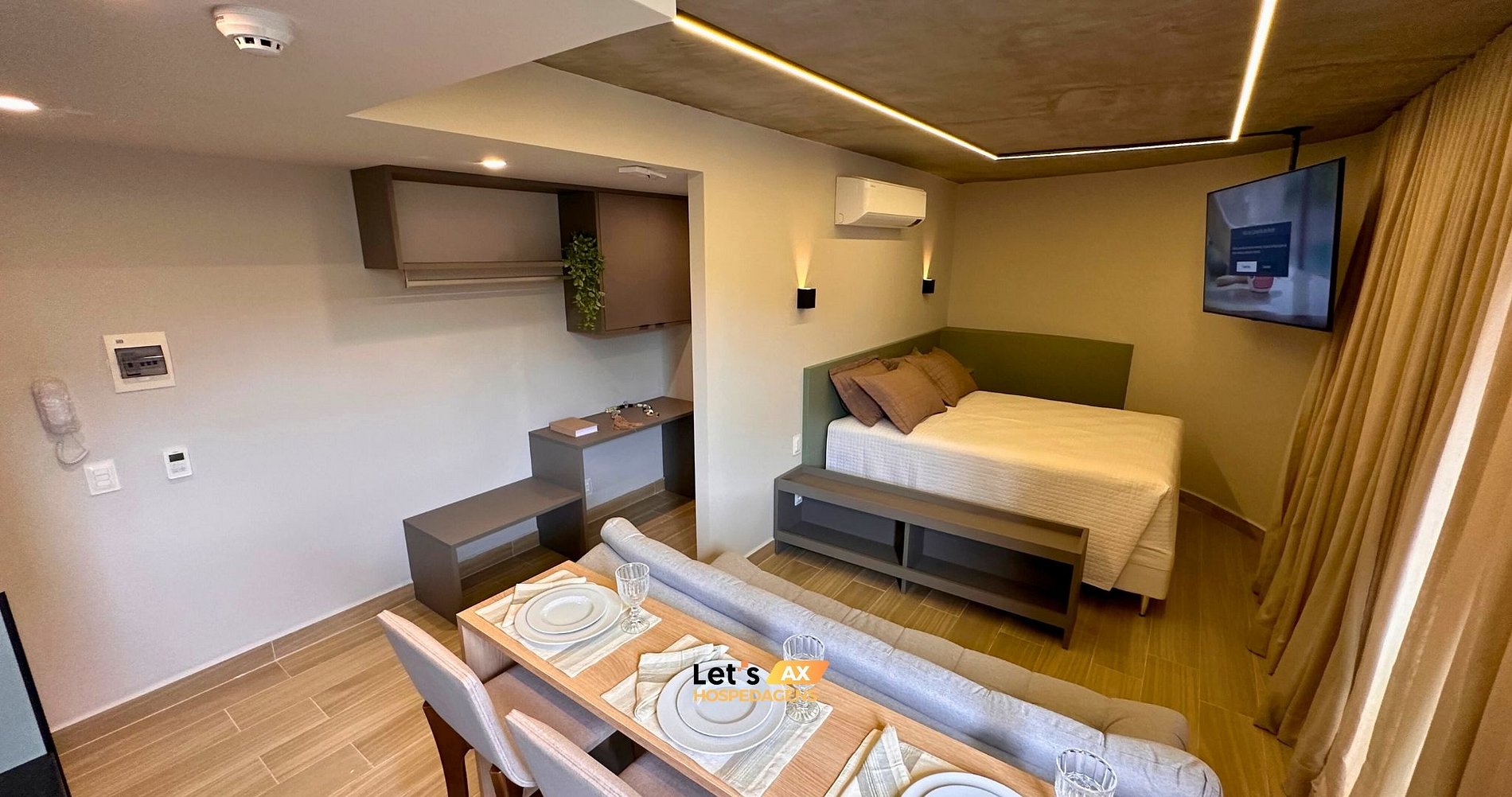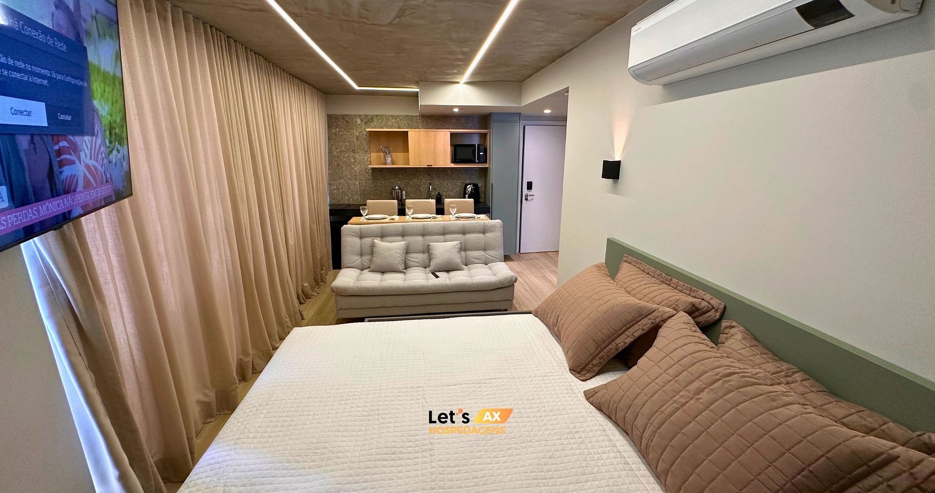 - Este Studio oferece: 01 Cama Queen, 01 Sofa cama e decoração sofisticada. lençóis premium, coberta, toalhas e travesseiros.