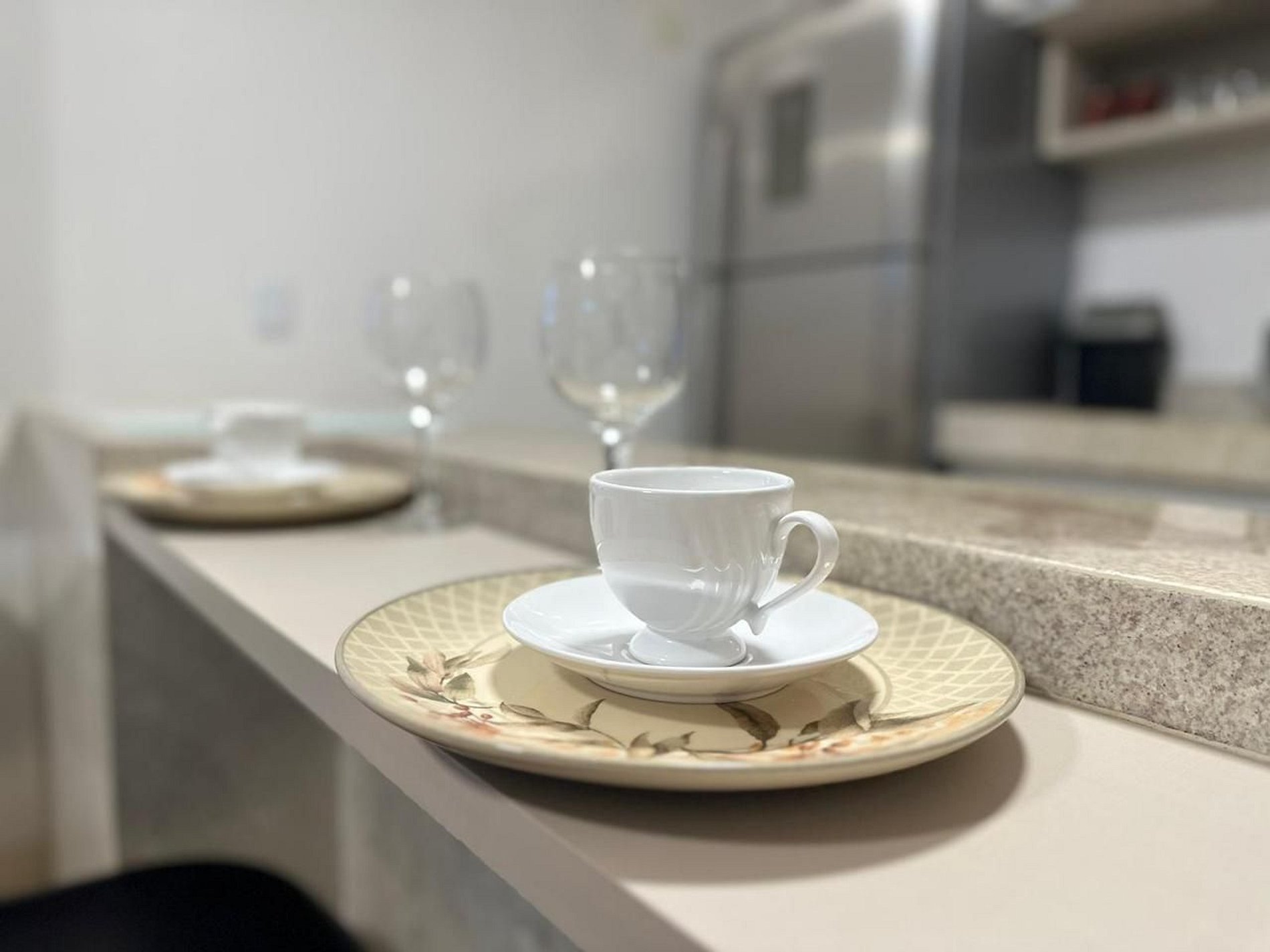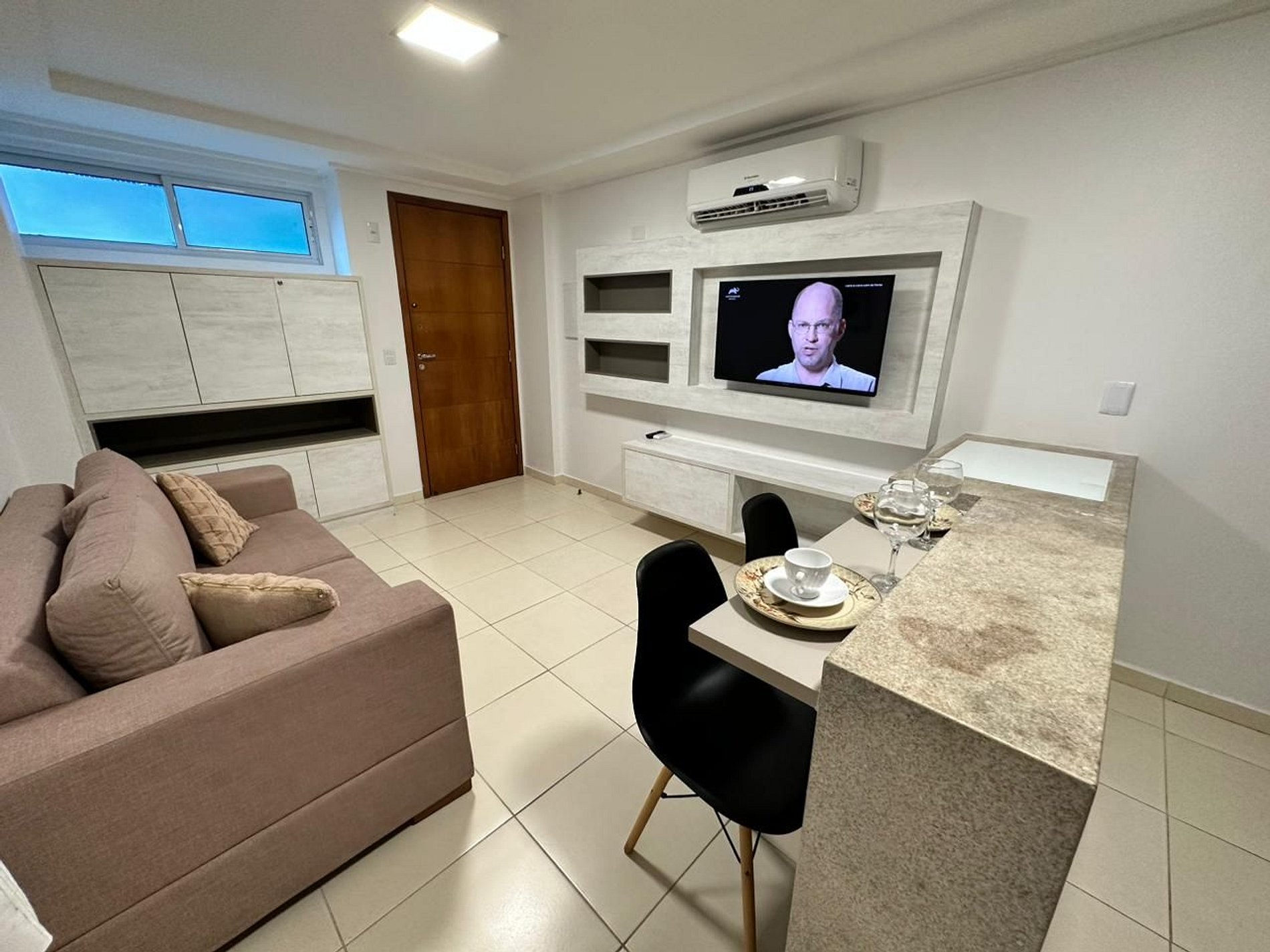 O flat é composto por quarto, sala com cozinha, banheiro e varanda. Dispõe de TV no quarto e na sala, geladeira, guarda-roupa, cama queen, sofá, ar-condicionado na sala e no quarto, e mesa na varanda.