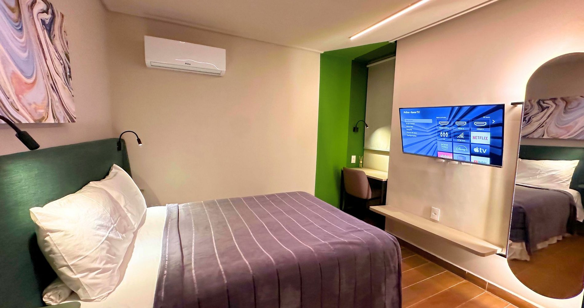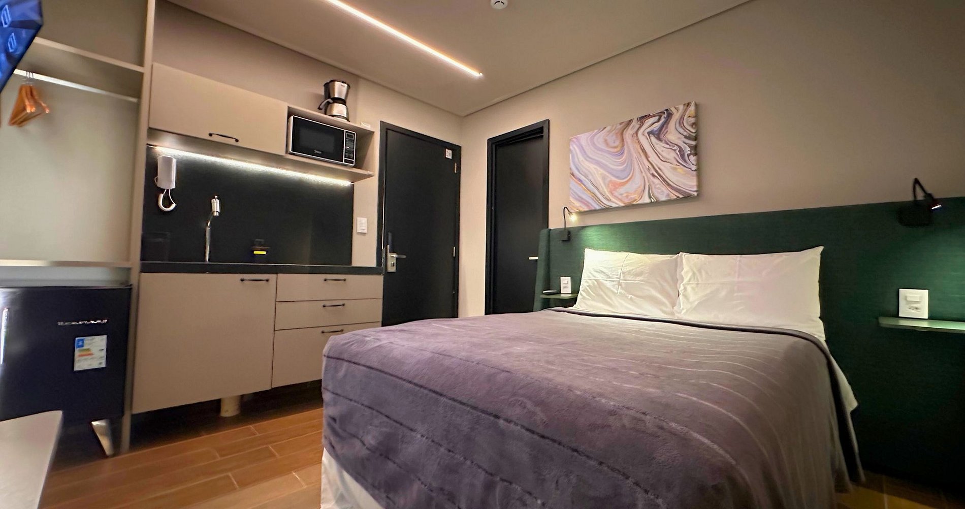 Desfrute de um studio elegante e completo, ideal para quem busca conforto, praticidade e um toque de sofisticação.