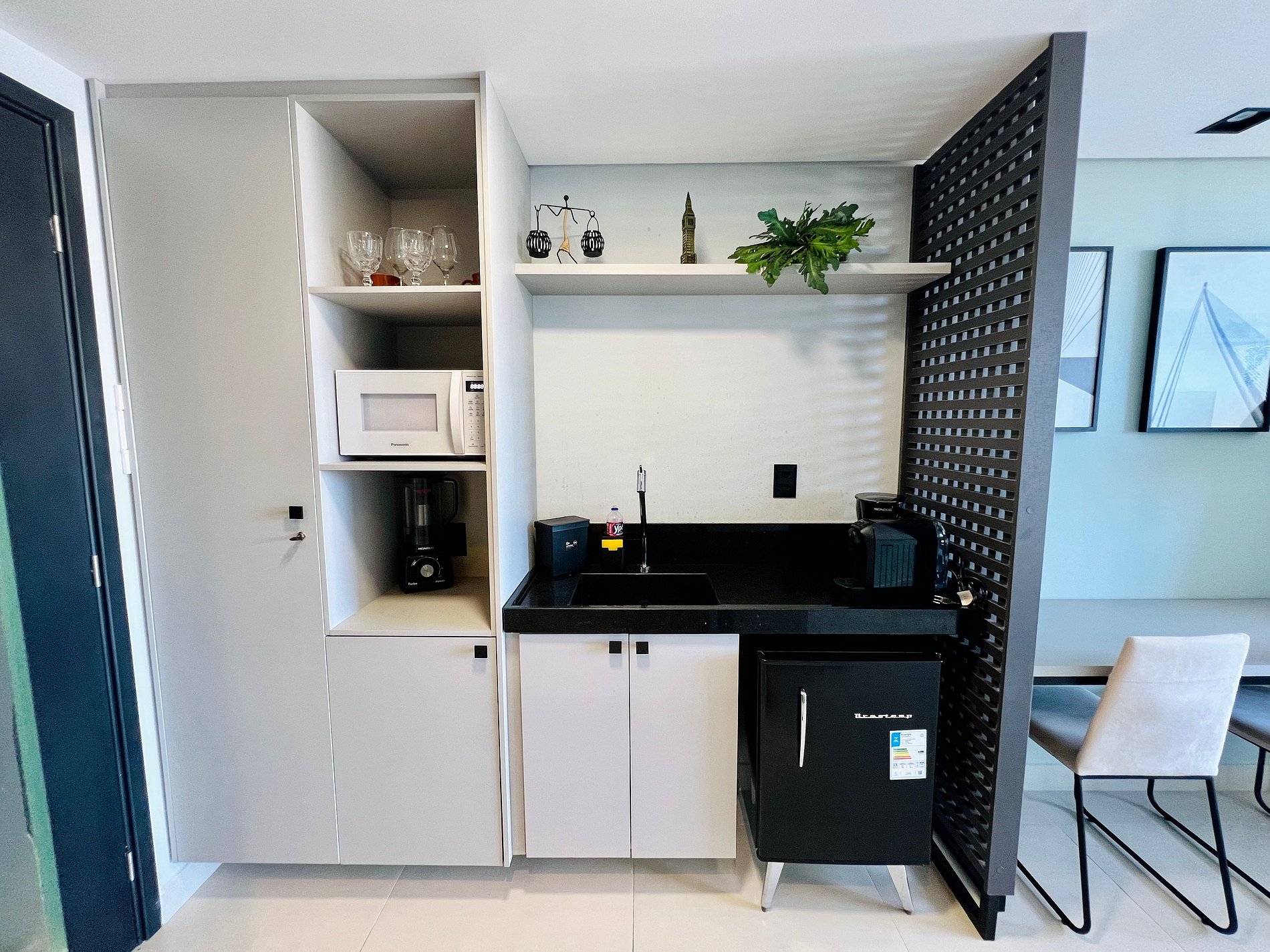 - Espaço projetado disponibilizando: Pratos, copos, talheres, microondas, sanduicheira e cafeteira.