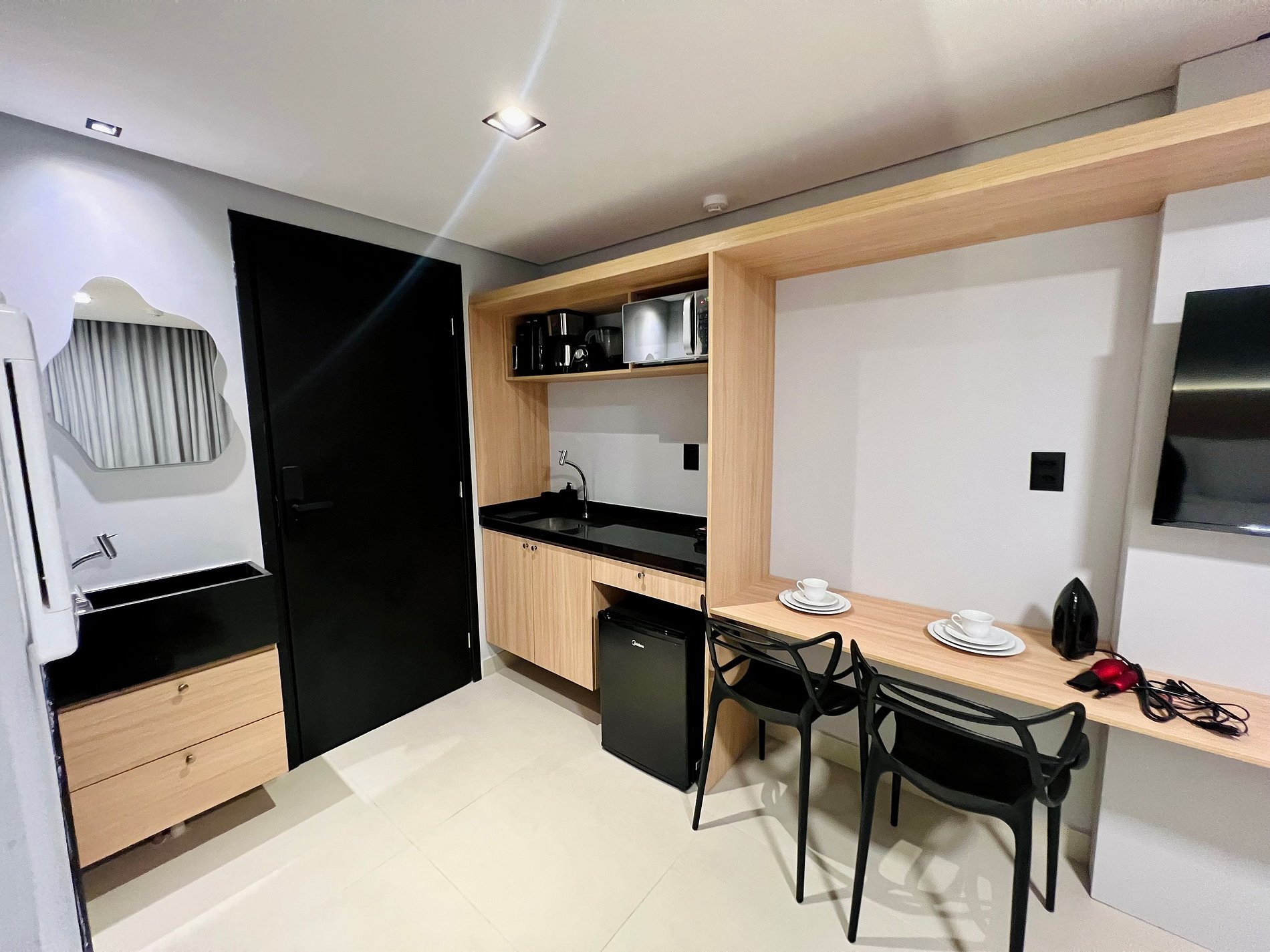 - Espaço projetado disponibilizando: Pratos, copos, talheres, microondas, sanduicheira e cafeteira.