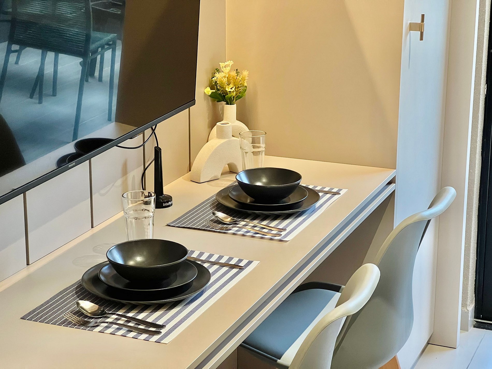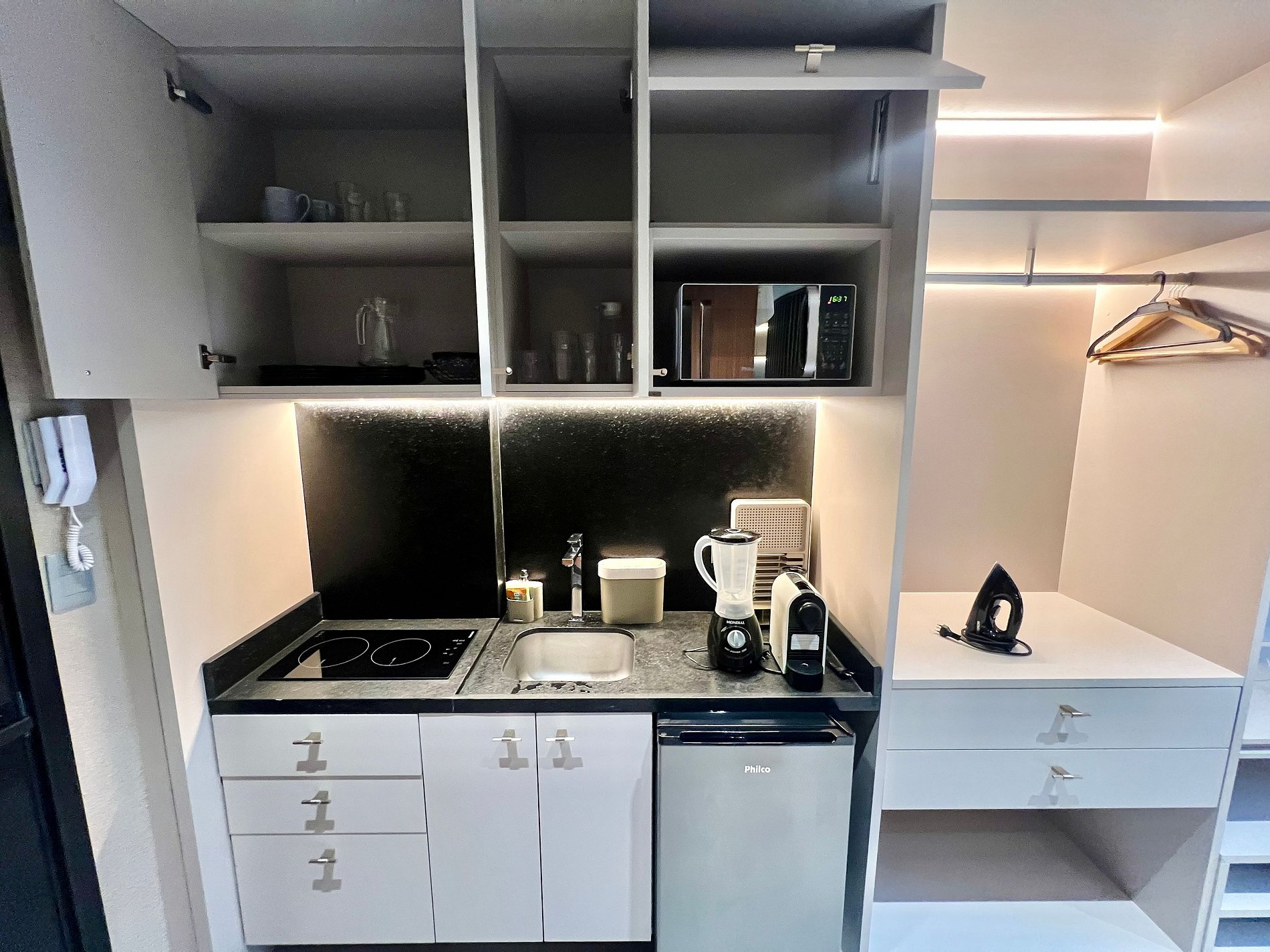 Espaço moderno, confortável e elegante. Flat com área externa e espaço para refeições. Possui Frigobar, microondas, cafeteira, pratos, copos e talheres. Quarto com ar-condicionado, 01 cama casal, lençóis premium, cobertor e toalhas.