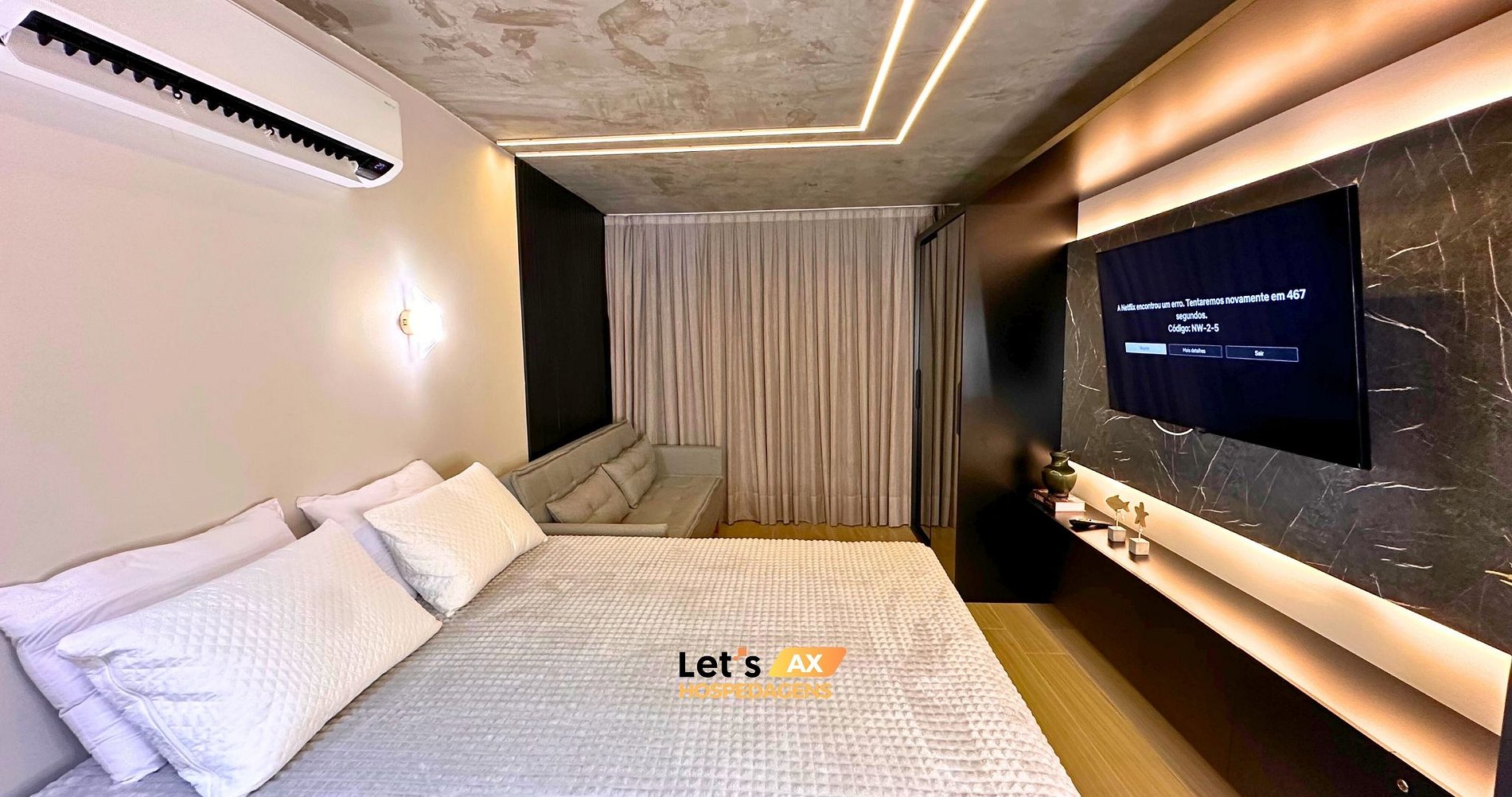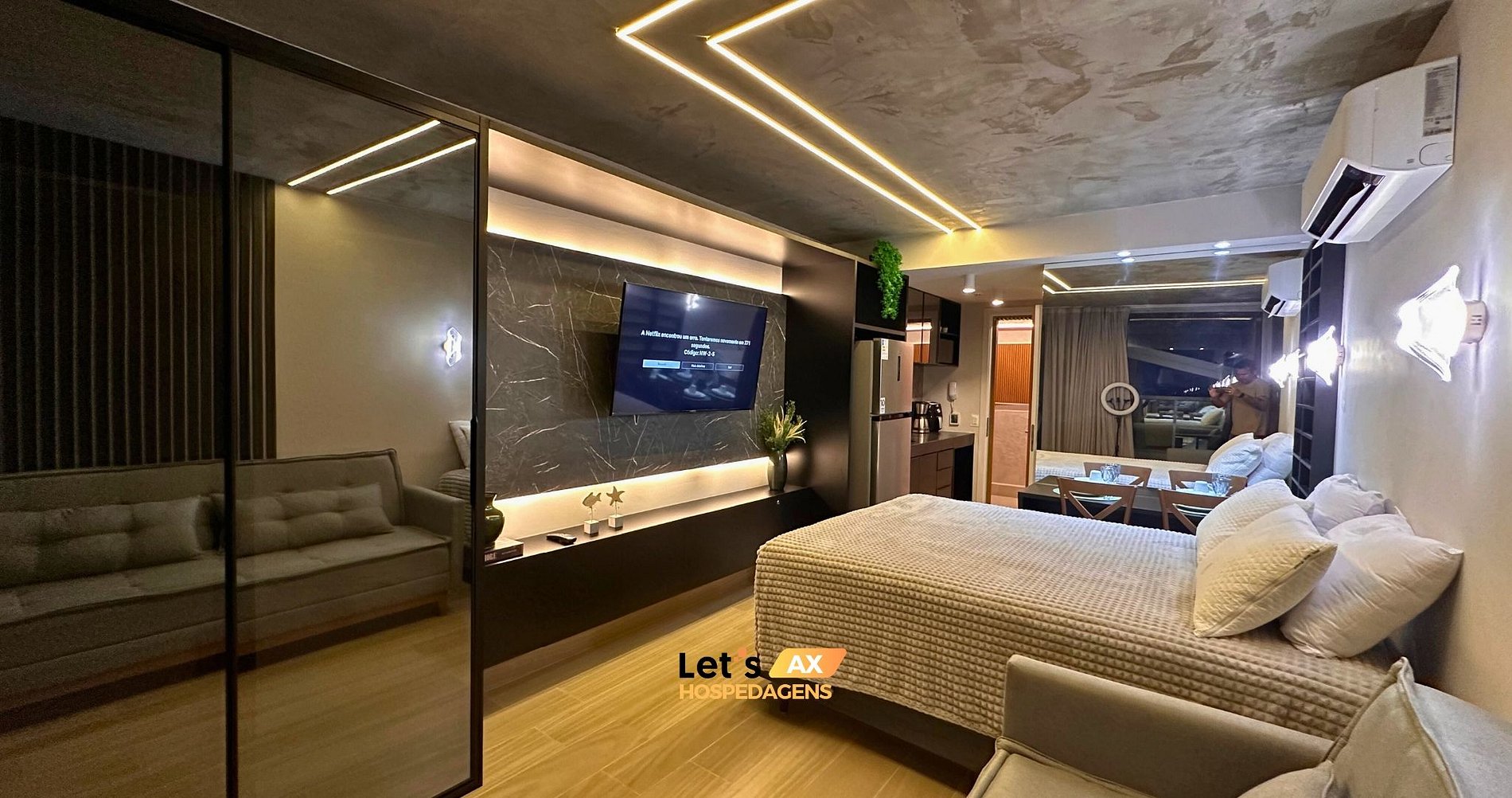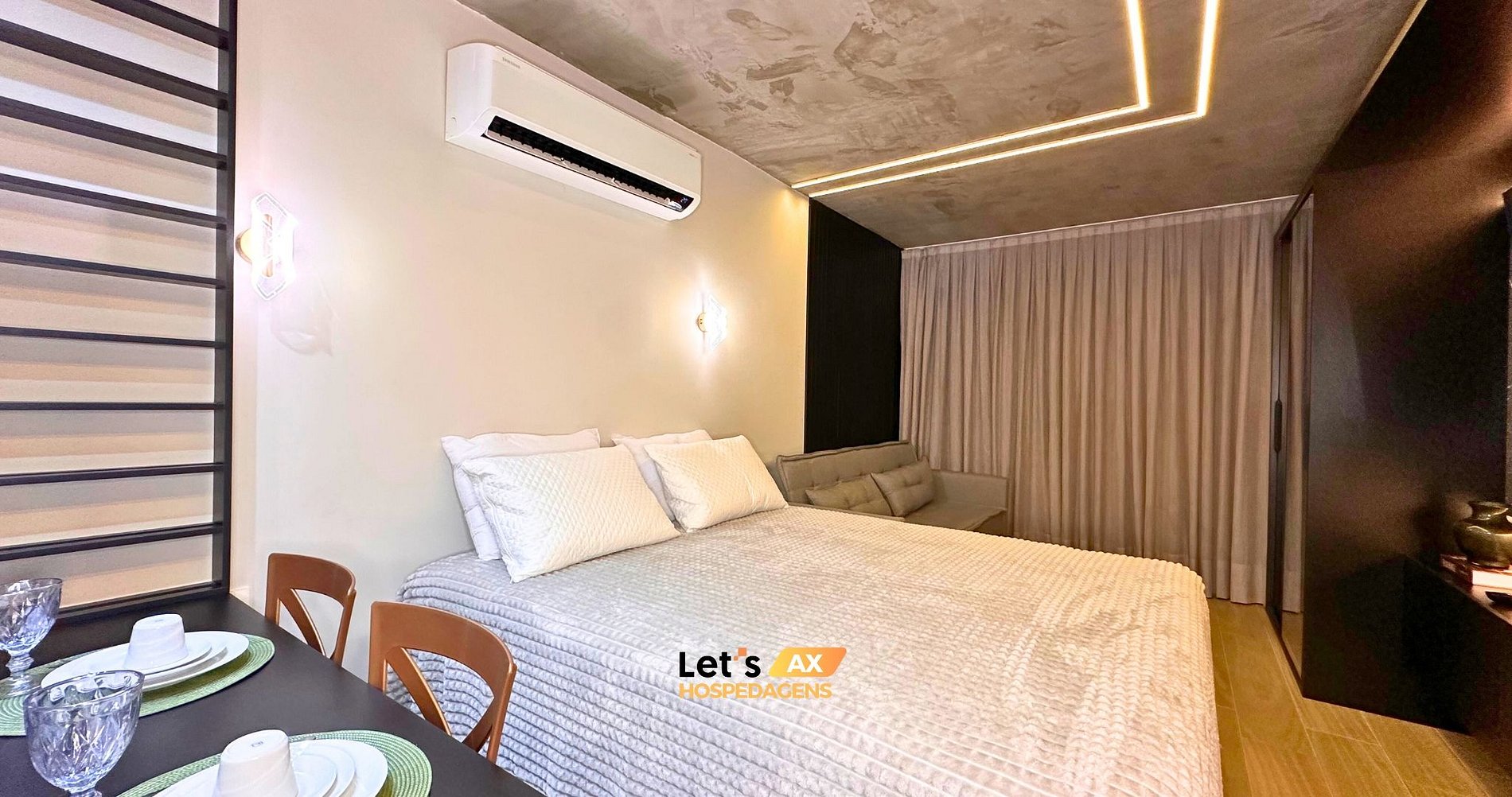 - Studio disponibilizando: Uma cama de casal, um sofá cama, lençóis premium, coberta, toalhas e travesseiros e uma decoração personalizada