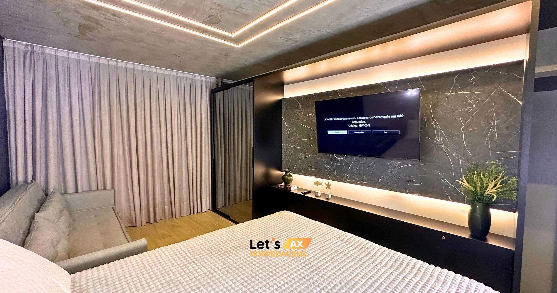 - Studio disponibilizando: Uma cama de casal, um sofá cama, lençóis premium, coberta, toalhas e travesseiros e uma decoração personalizada