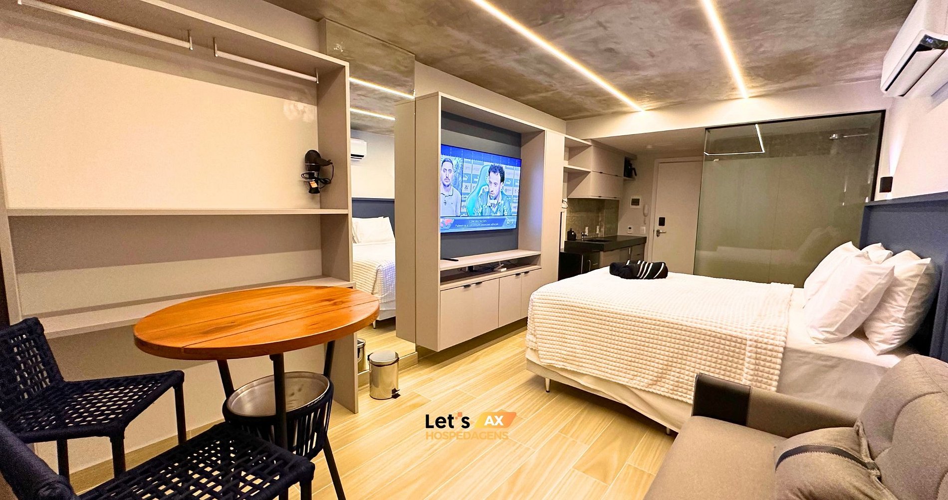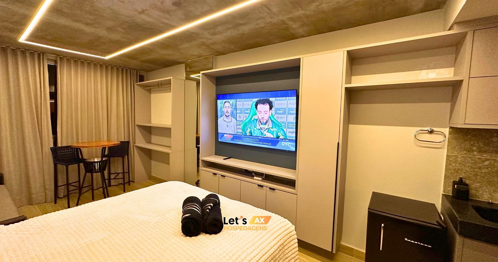 - Este Studio oferece: 01 Cama Queen, 01 Sofa cama e decoração sofisticada, lençóis premium, coberta, toalhas e travesseiros.