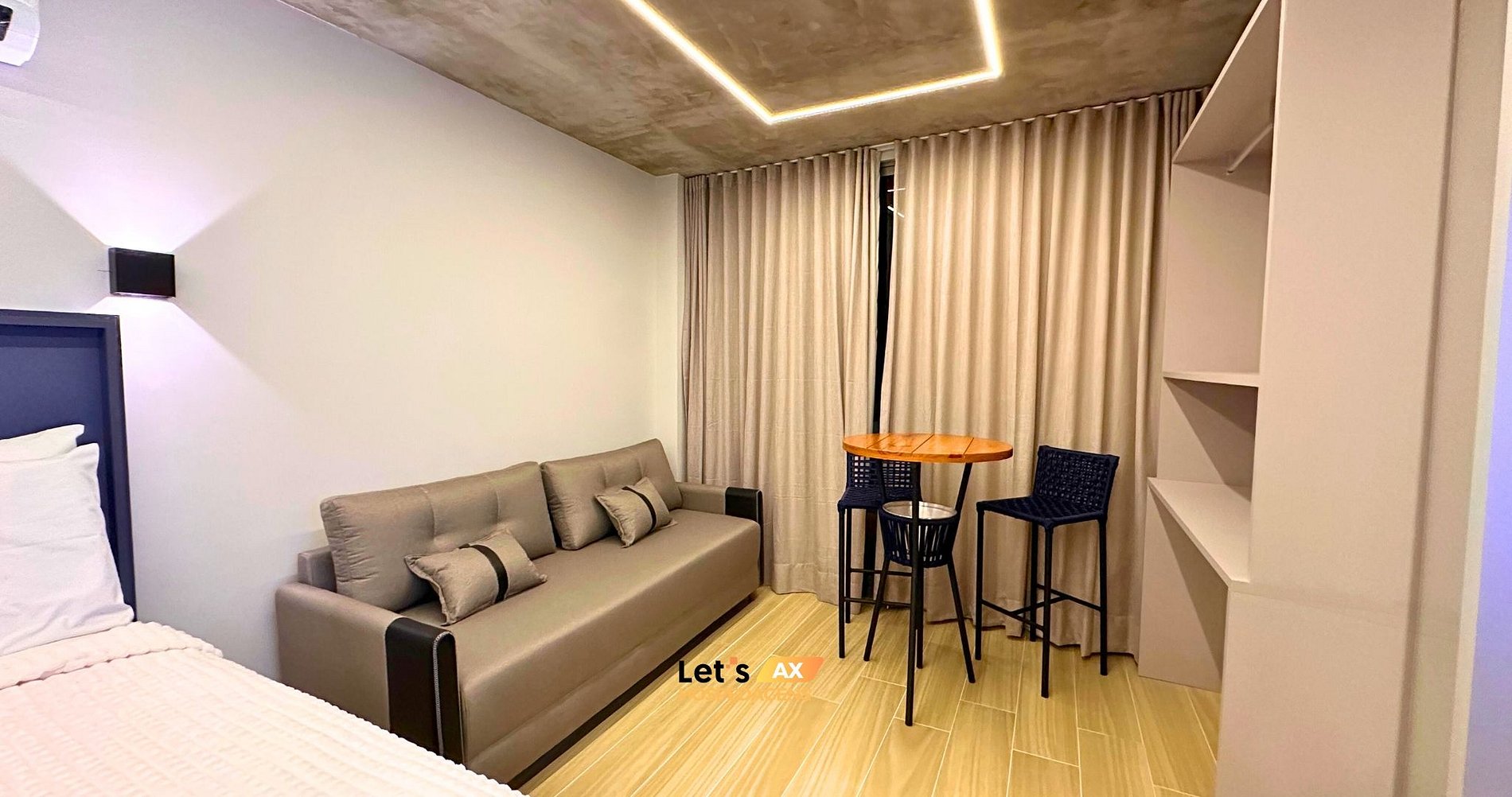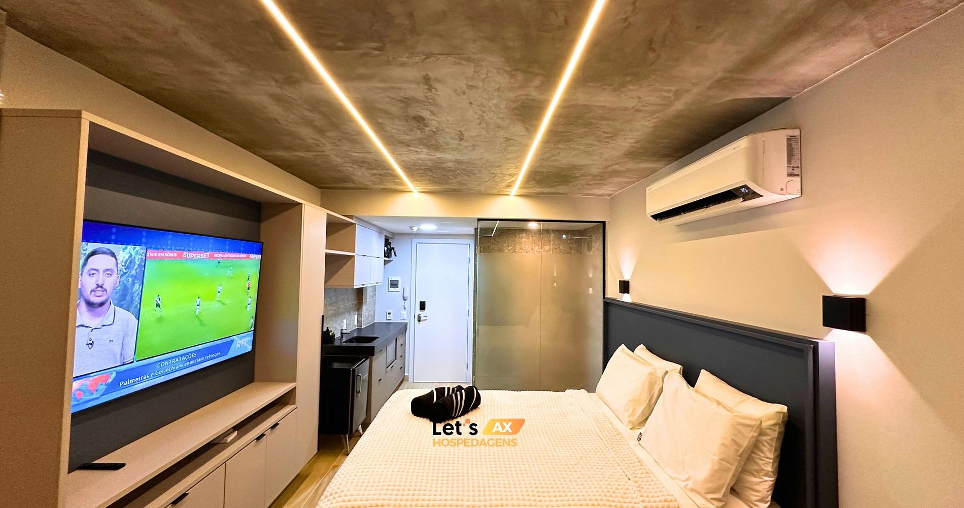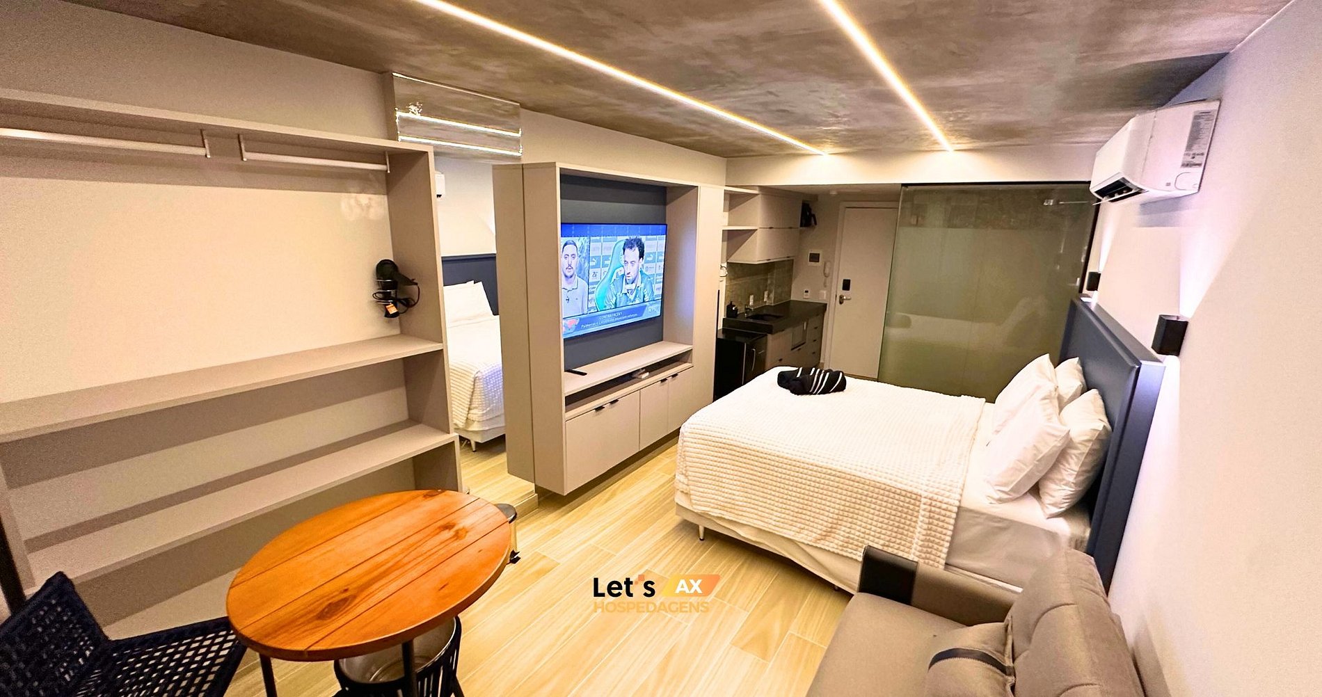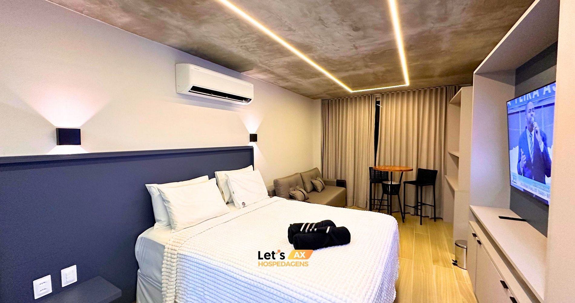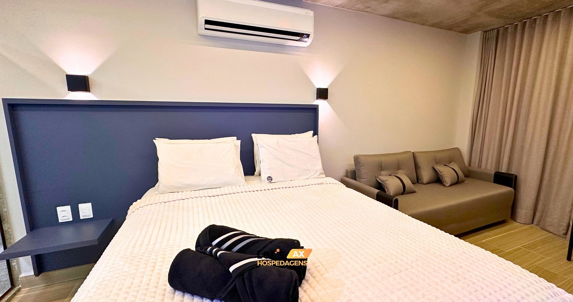 - Este Studio oferece: 01 Cama Queen, 01 Sofa cama e decoração sofisticada, lençóis premium, coberta, toalhas e travesseiros.