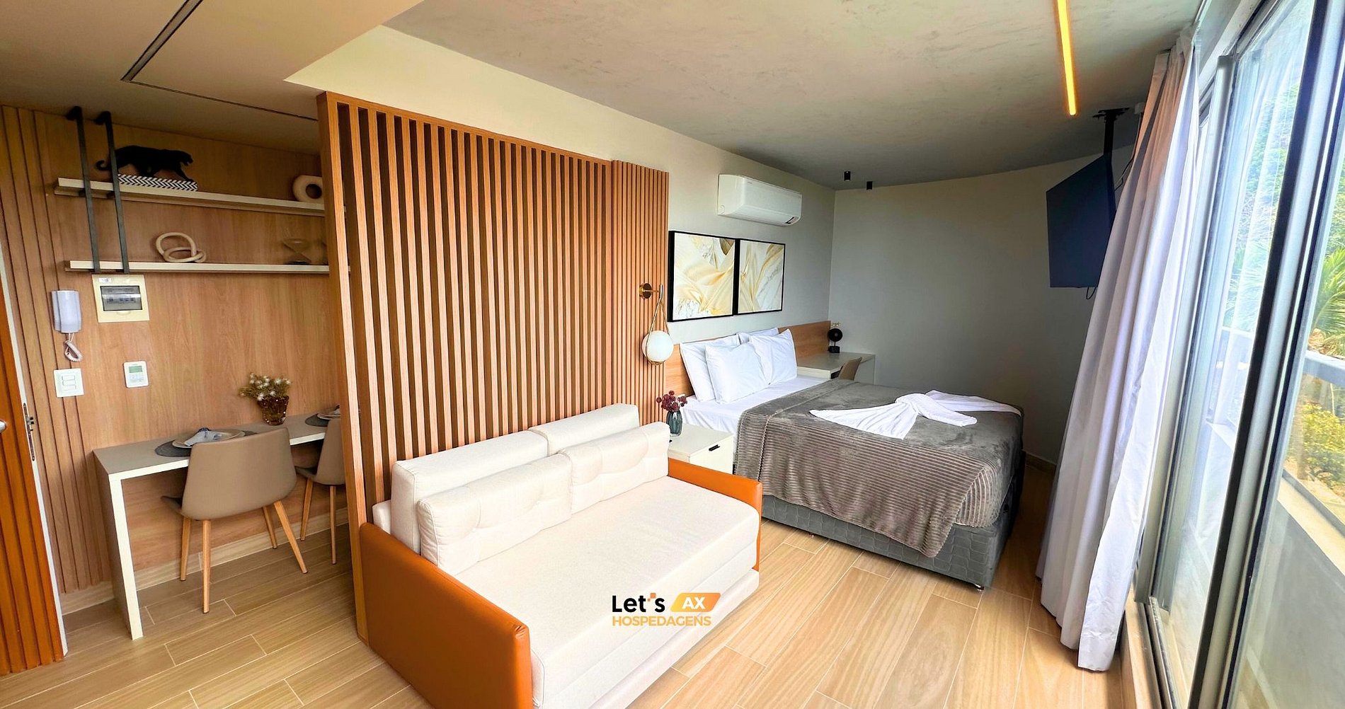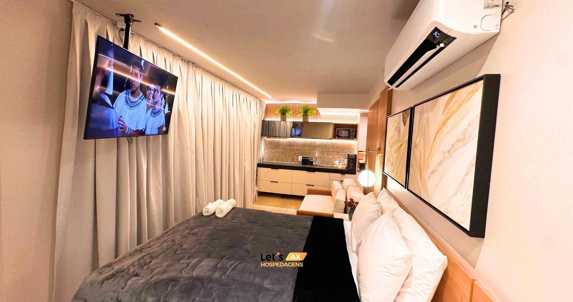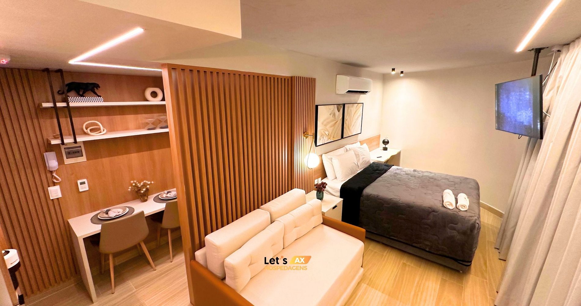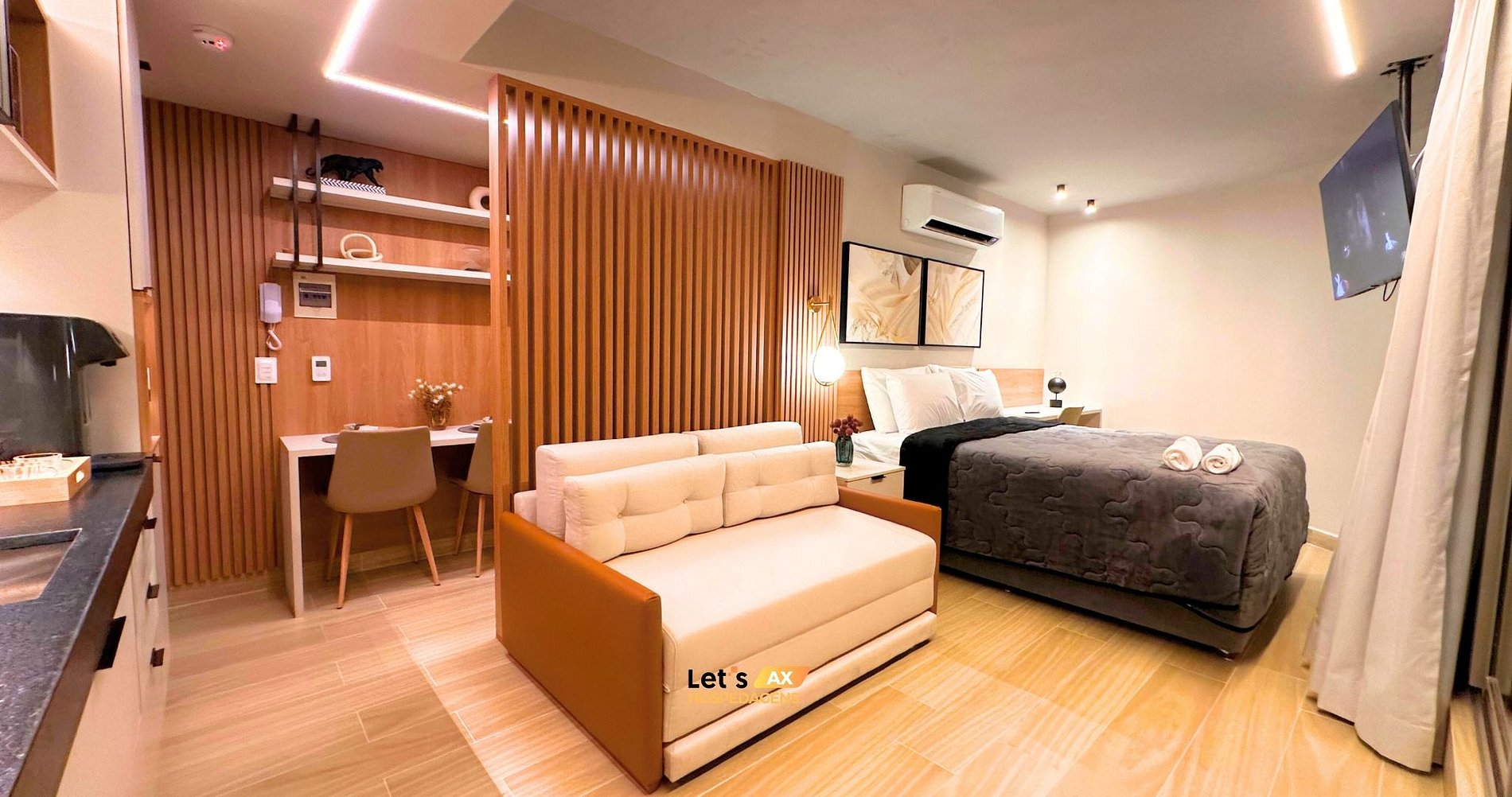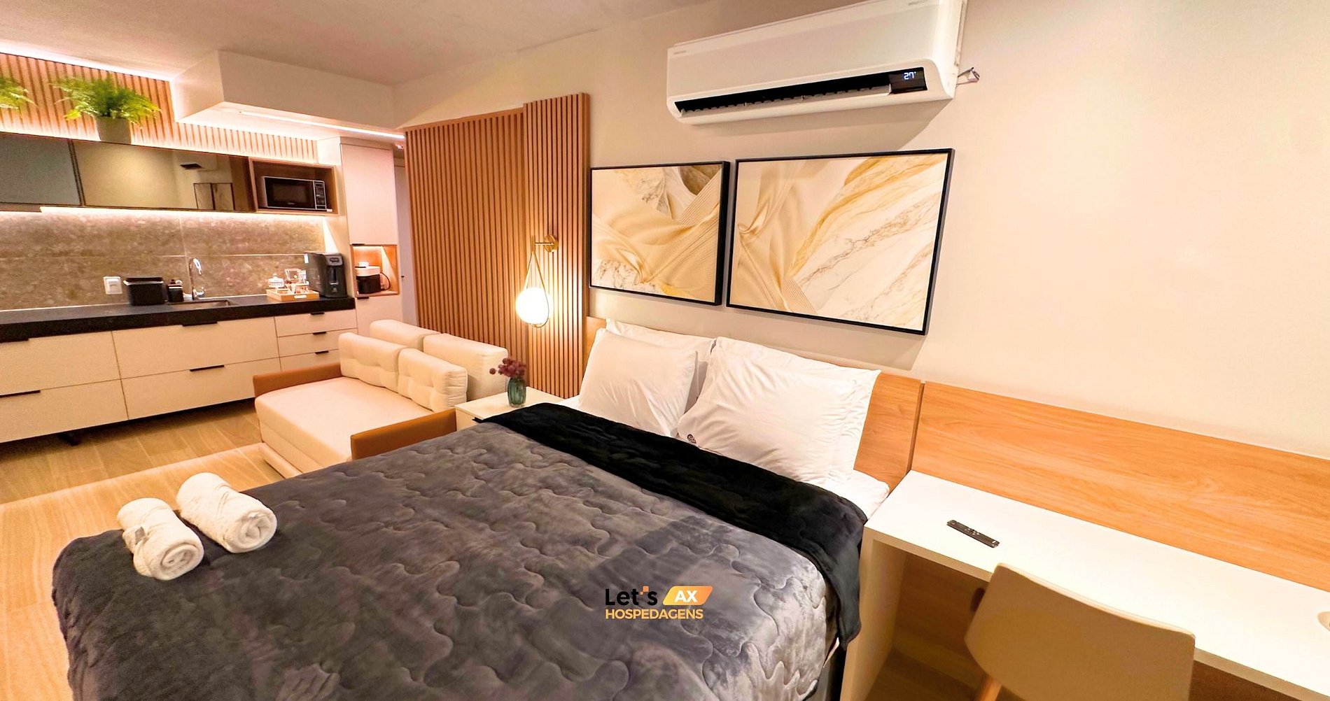 - Este Studio oferece: 01 Cama Queen, 01 Sofa cama e decoração sofisticada, lençóis premium, coberta, toalhas e travesseiros.