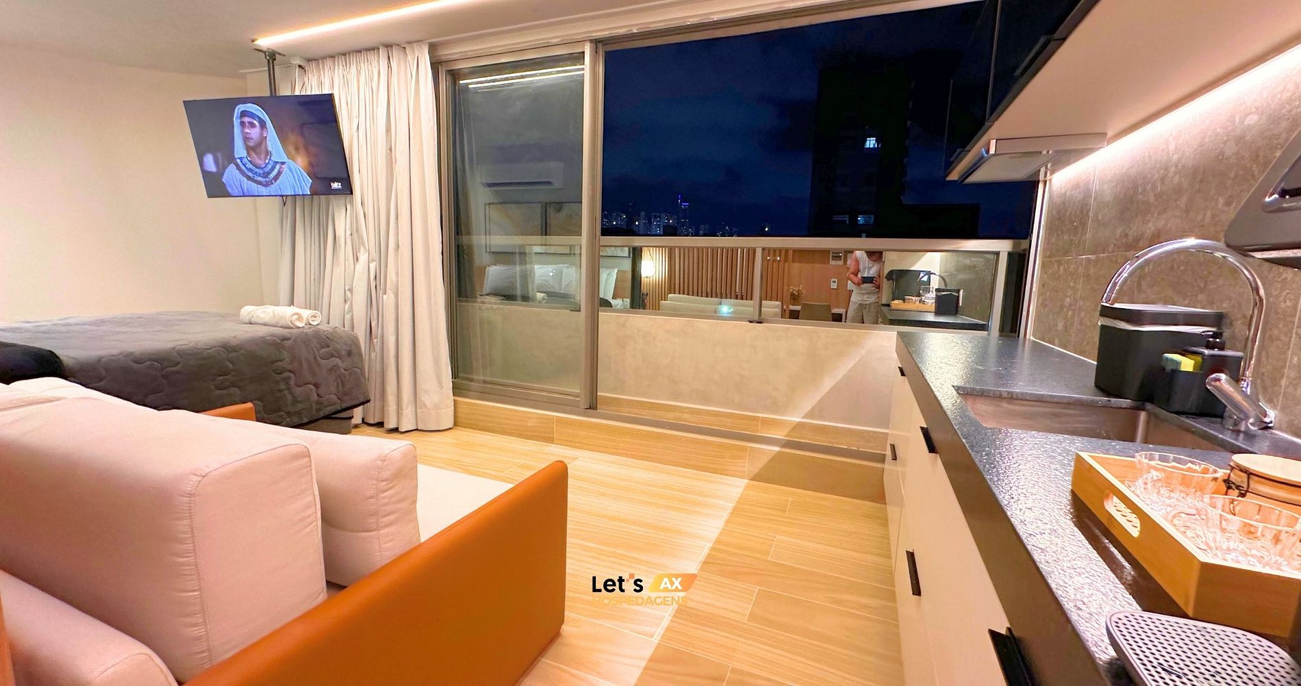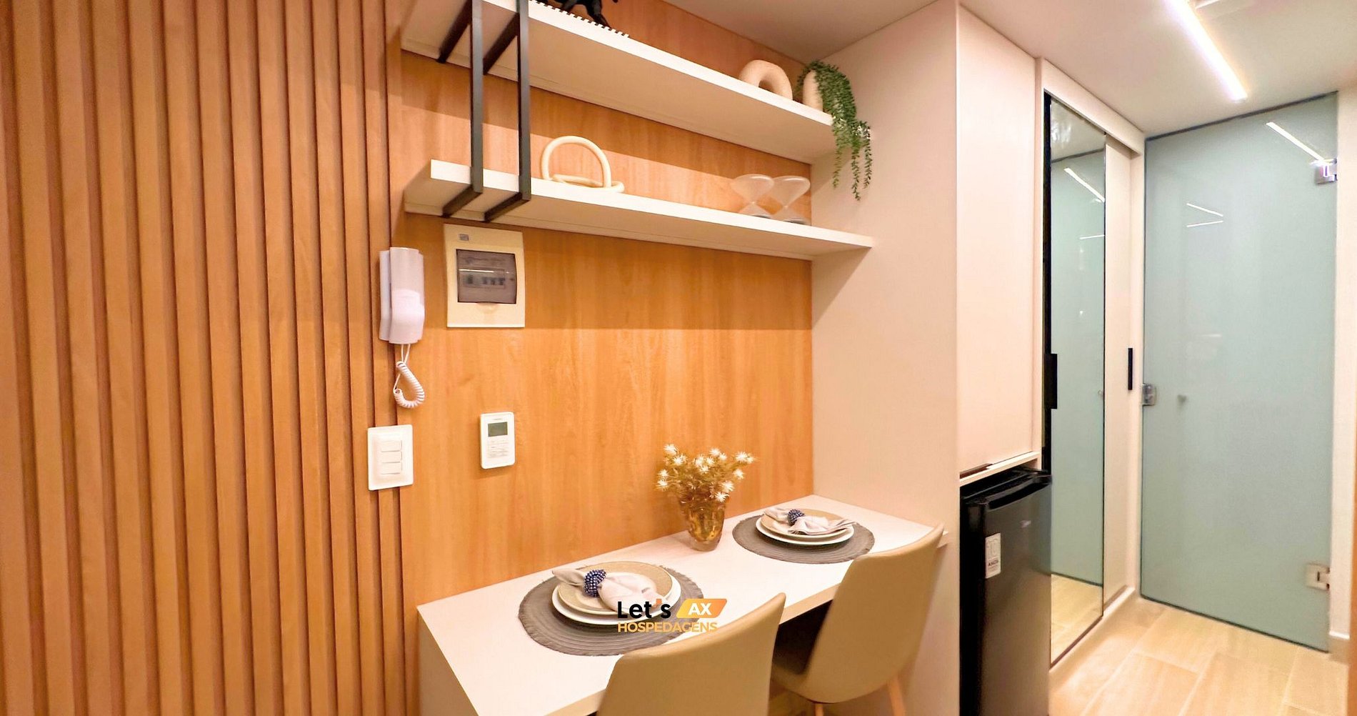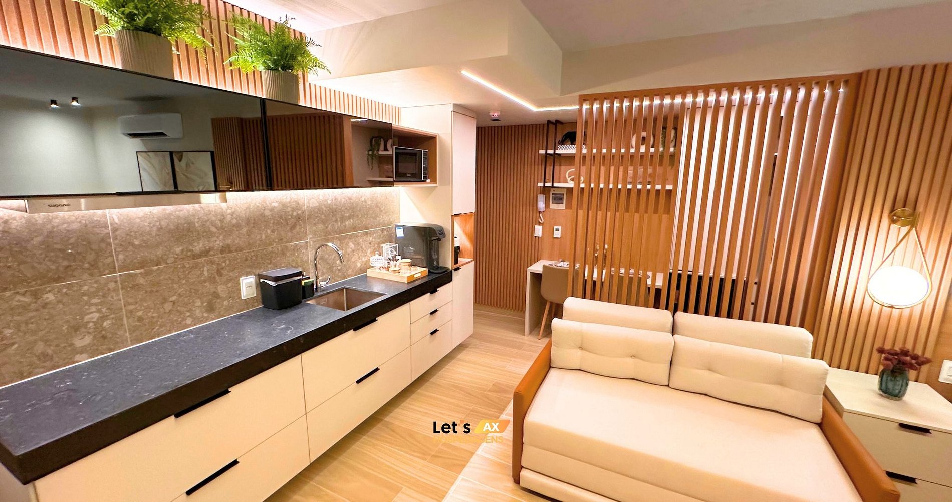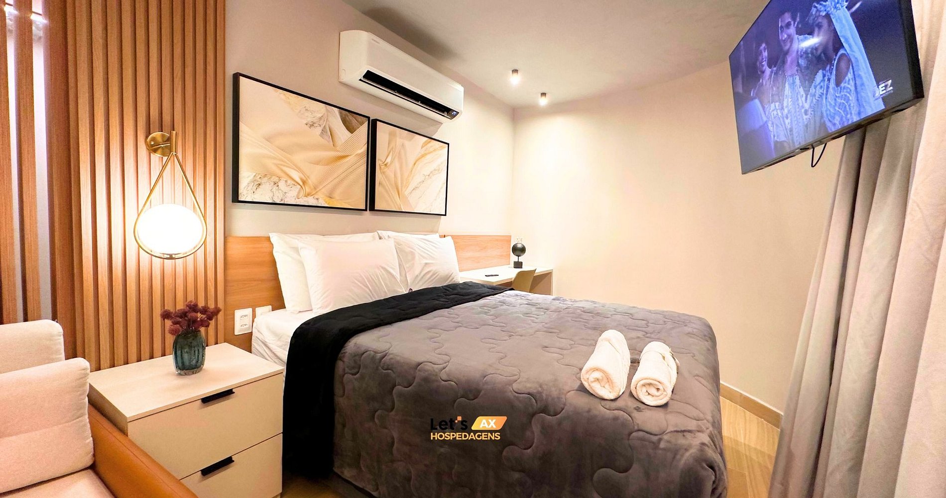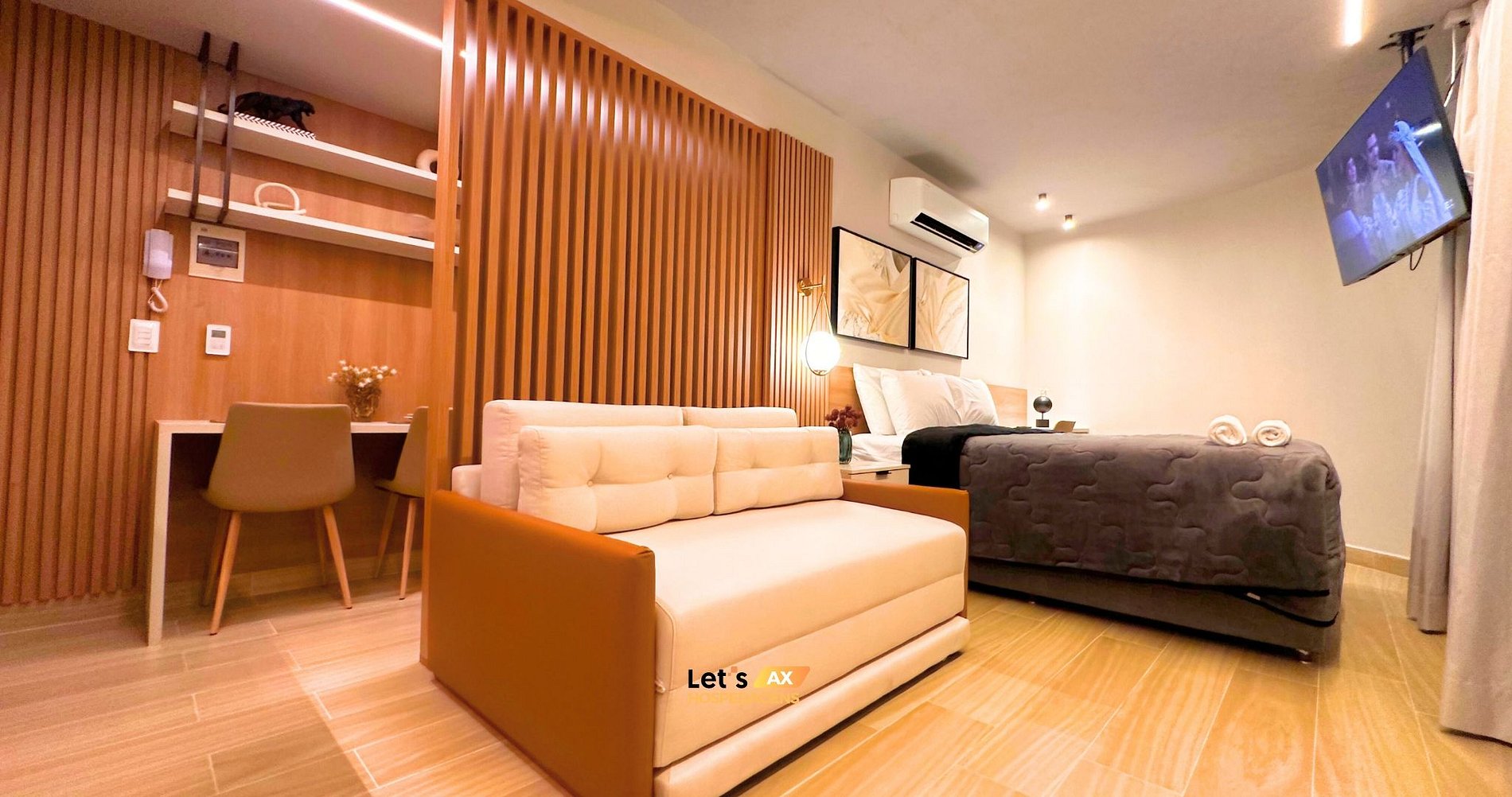 - Este Studio oferece: 01 Cama Queen, 01 Sofa cama e decoração sofisticada, lençóis premium, coberta, toalhas e travesseiros.