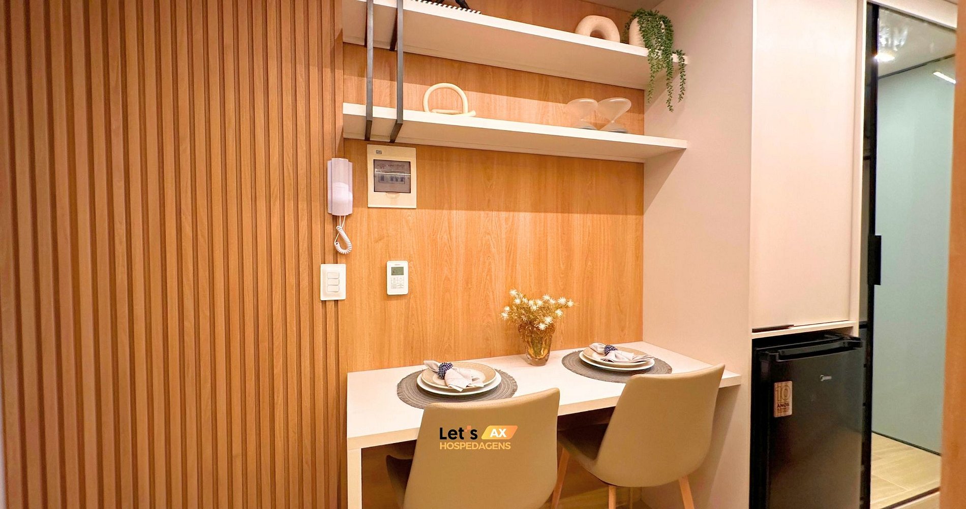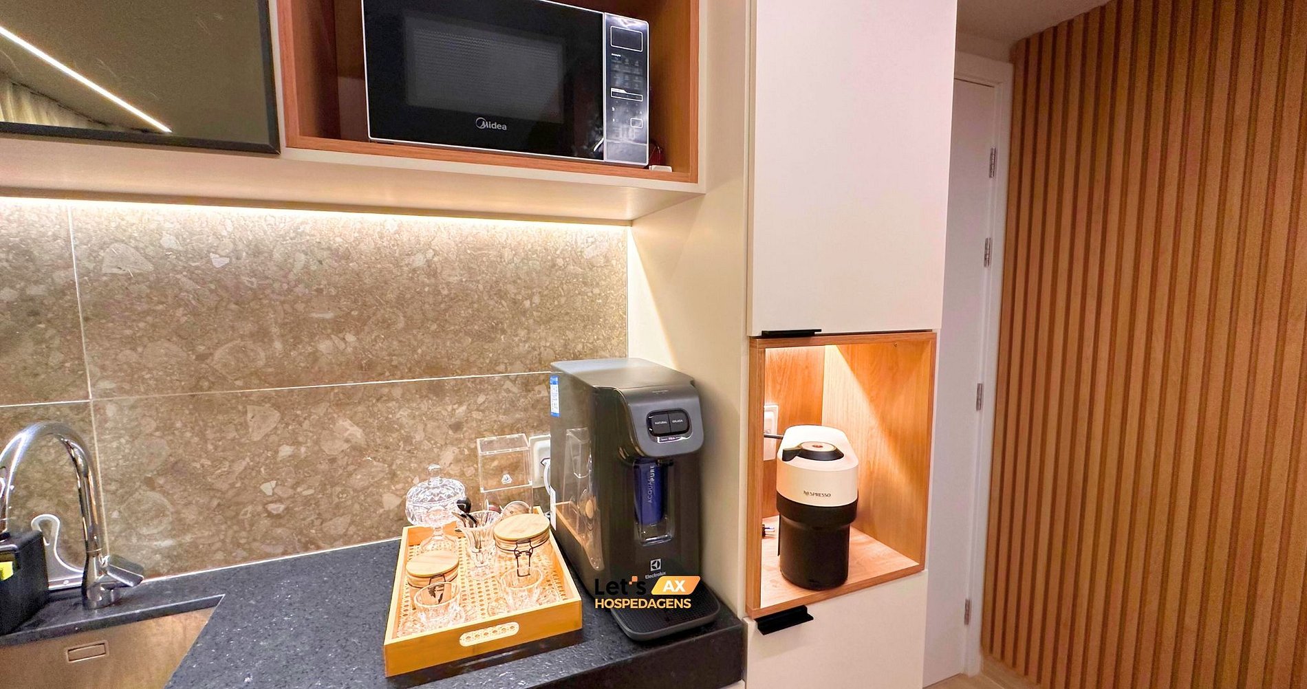 - Espaço projetado disponibilizando: Pratos, copos, talheres, microondas, cafeteira.