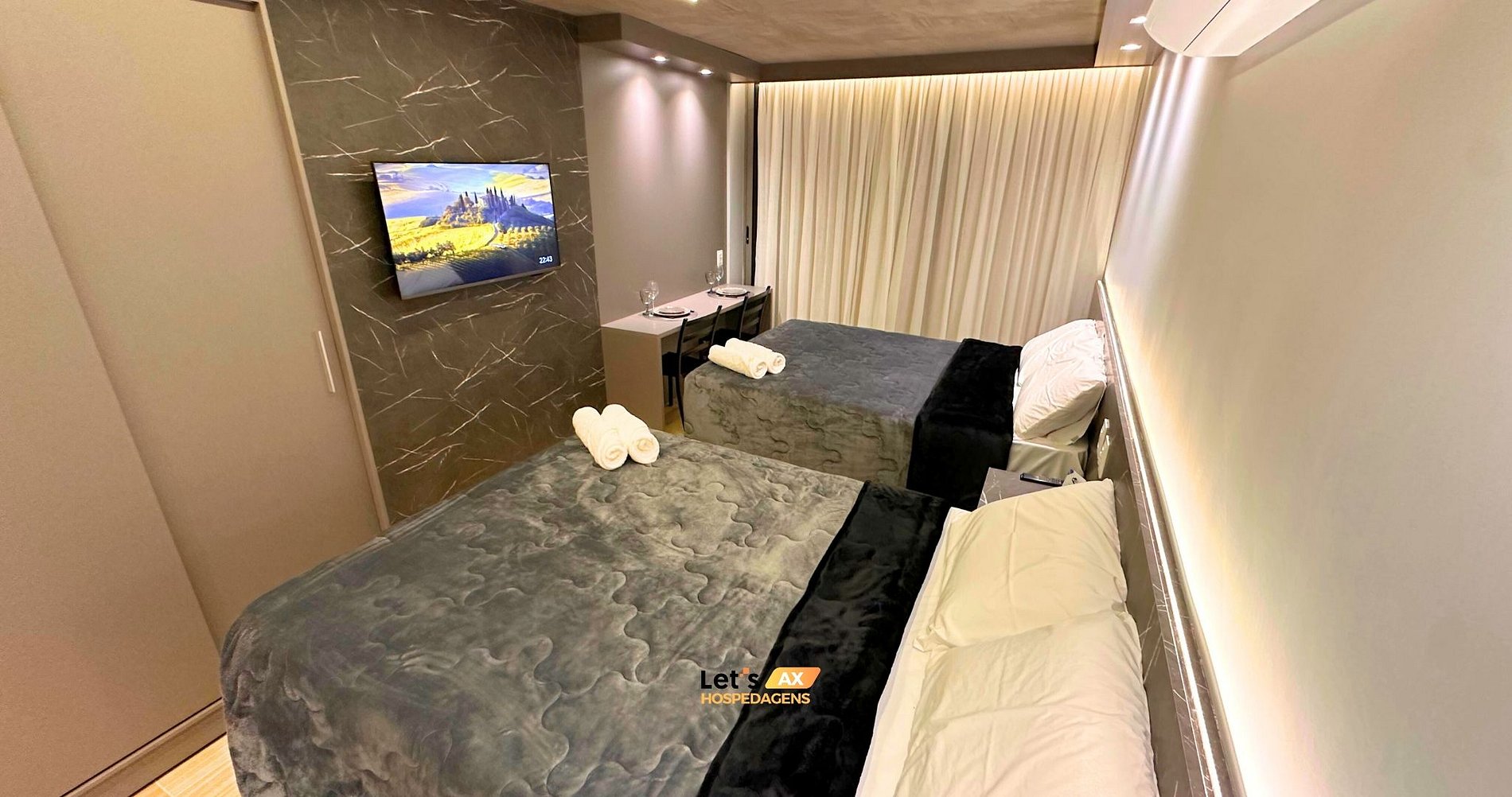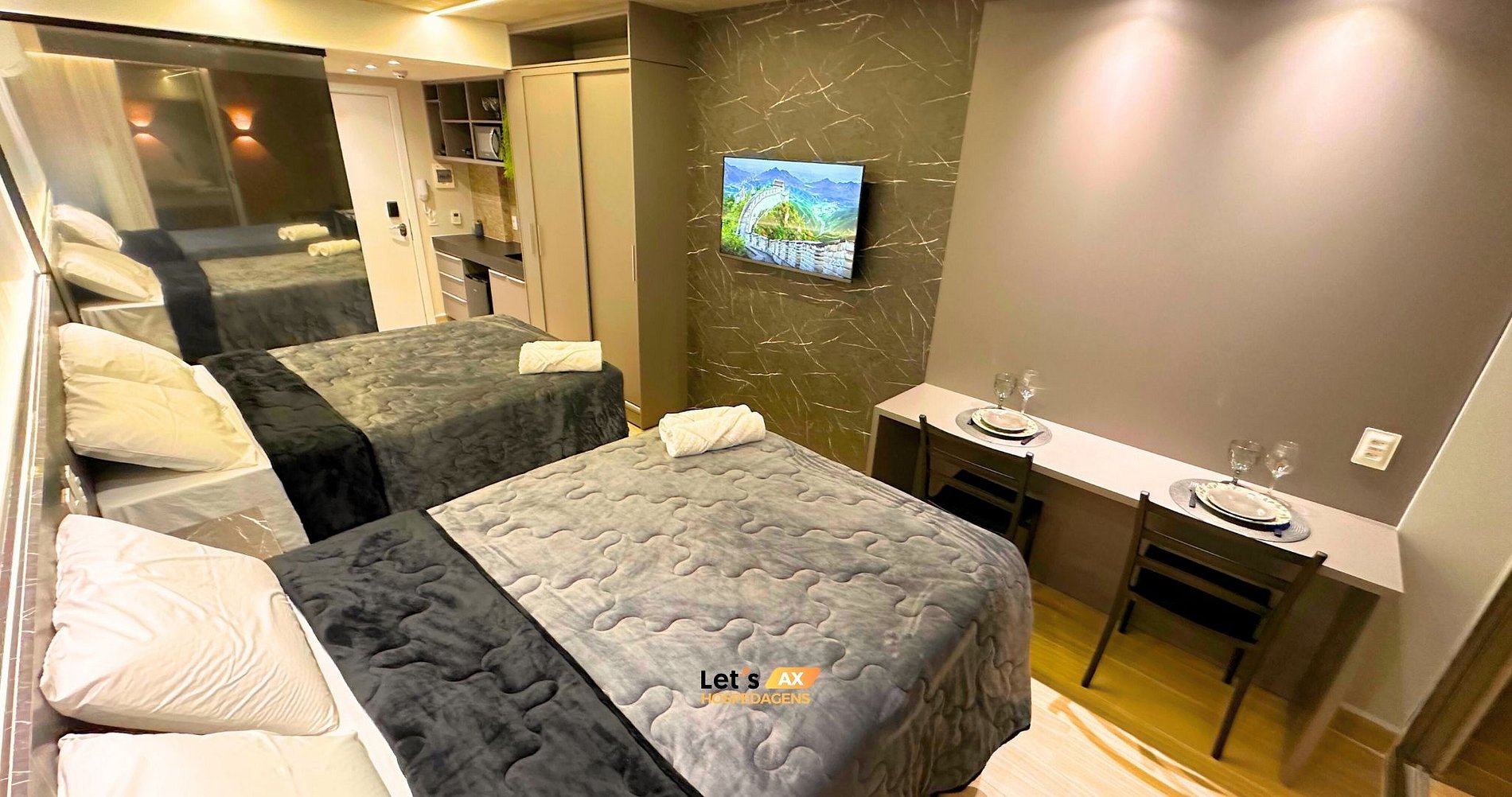 - Studio disponibilizando: Duas camas de casal, lençóis premium, coberta, toalhas e travesseiros.