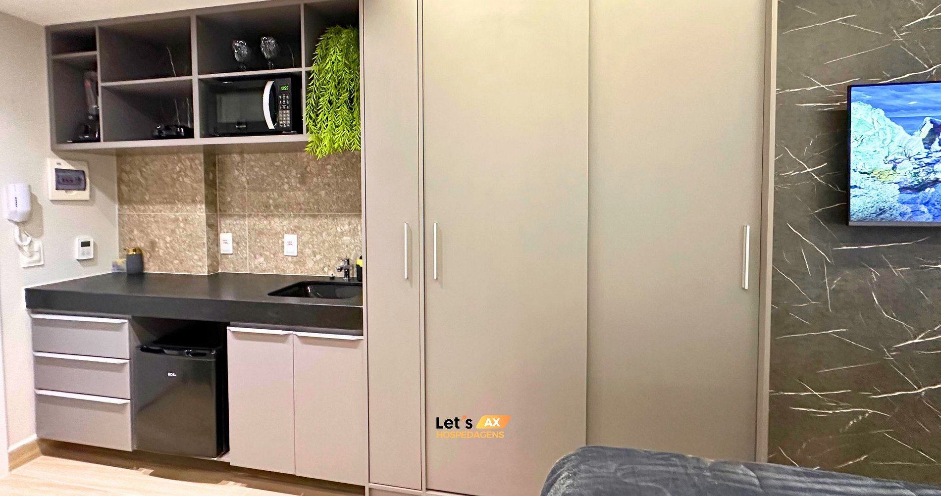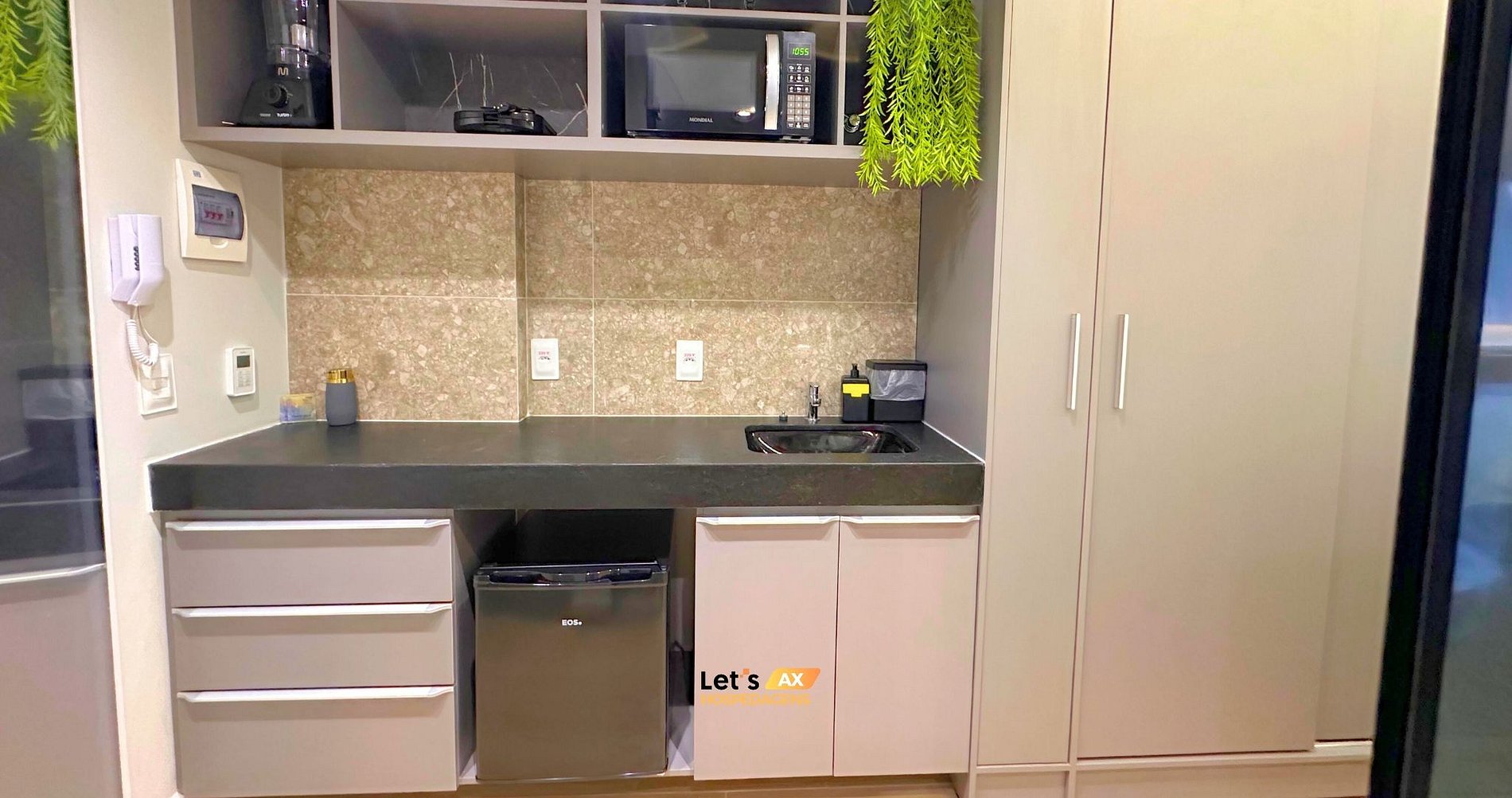 - Espaço projetado disponibilizando: Pratos, copos, talheres, microondas, sanduicheira e cafeteira.