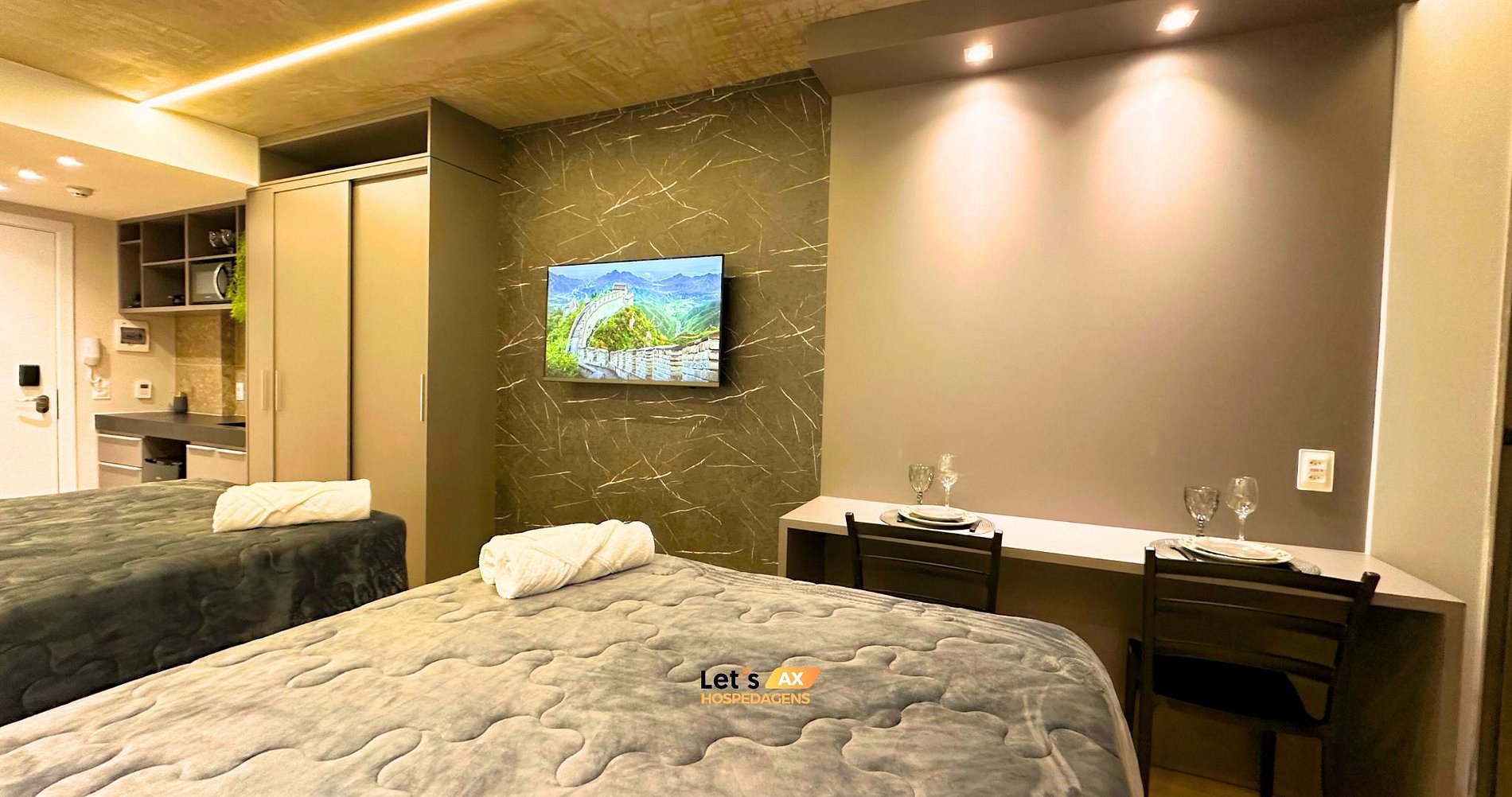 - Studio disponibilizando: Duas camas de casal, lençóis premium, coberta, toalhas e travesseiros.