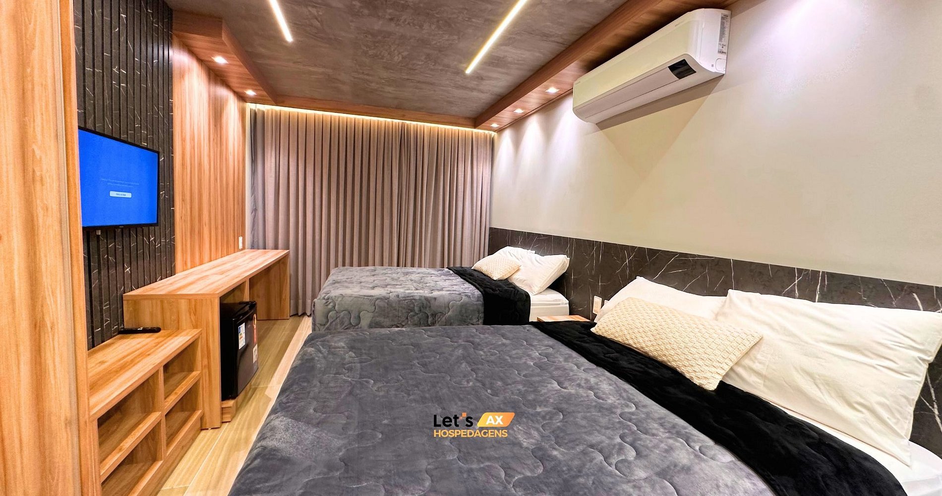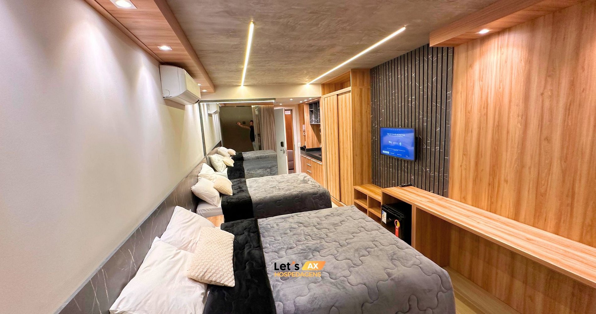 - Studio disponibilizando: Duas camas de casal, lençóis premium, coberta, toalhas e travesseiros.