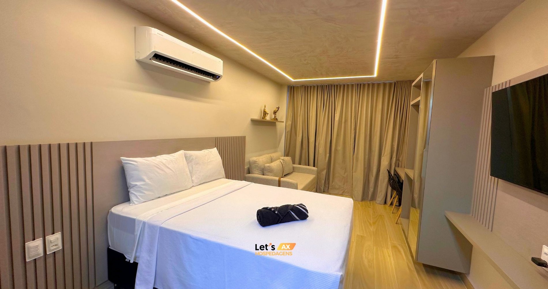 - Studio disponibilizando: Duas camas de casal, lençóis premium, coberta, toalhas e travesseiros.