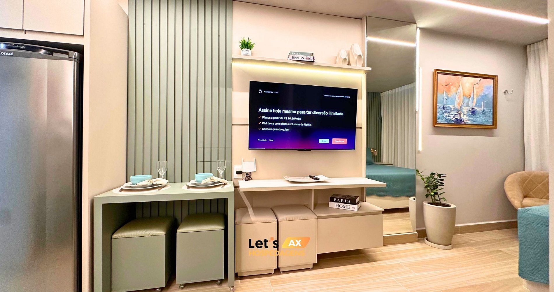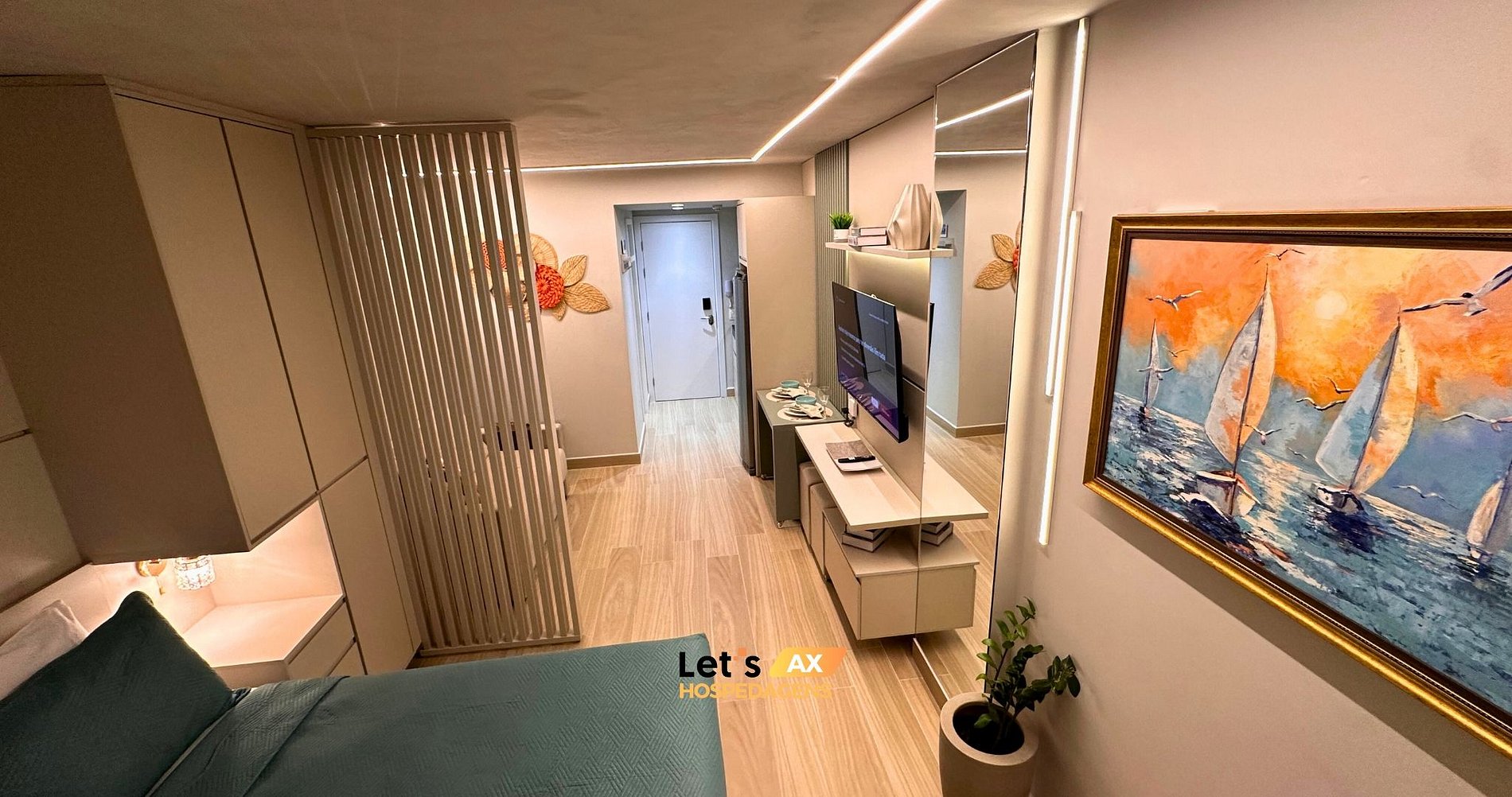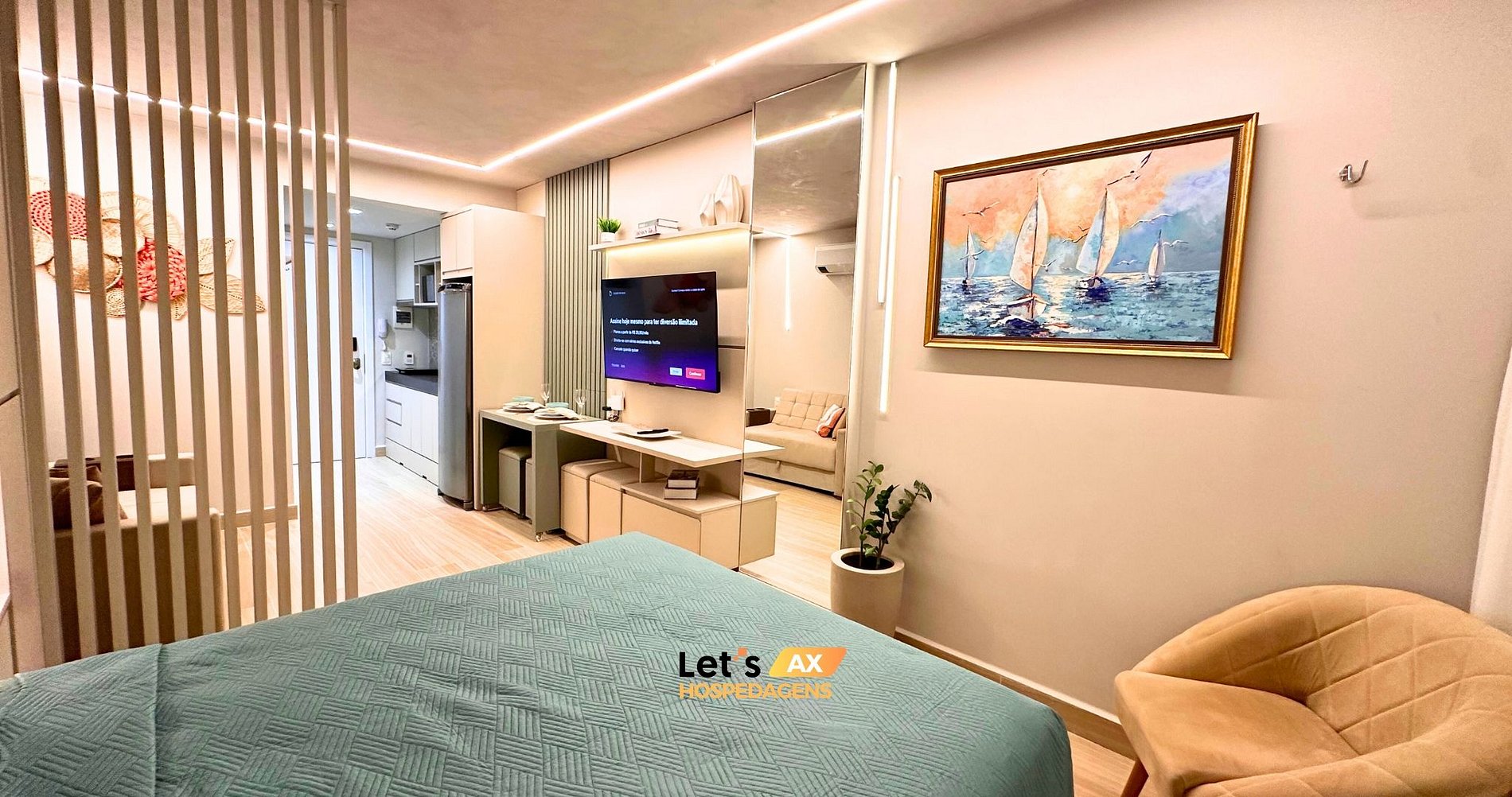 - Este Studio oferece: 01 Cama Queen, 01 Sofa cama e decoração sofisticada.