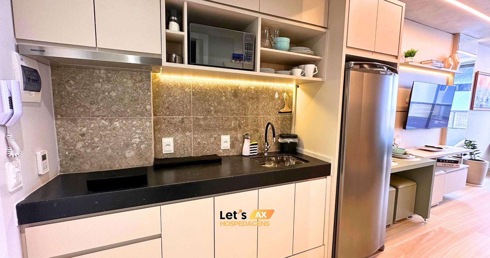 - Espaço projetado disponibilizando: Pratos, copos, talheres, microondas, sanduicheira e cafeteira.