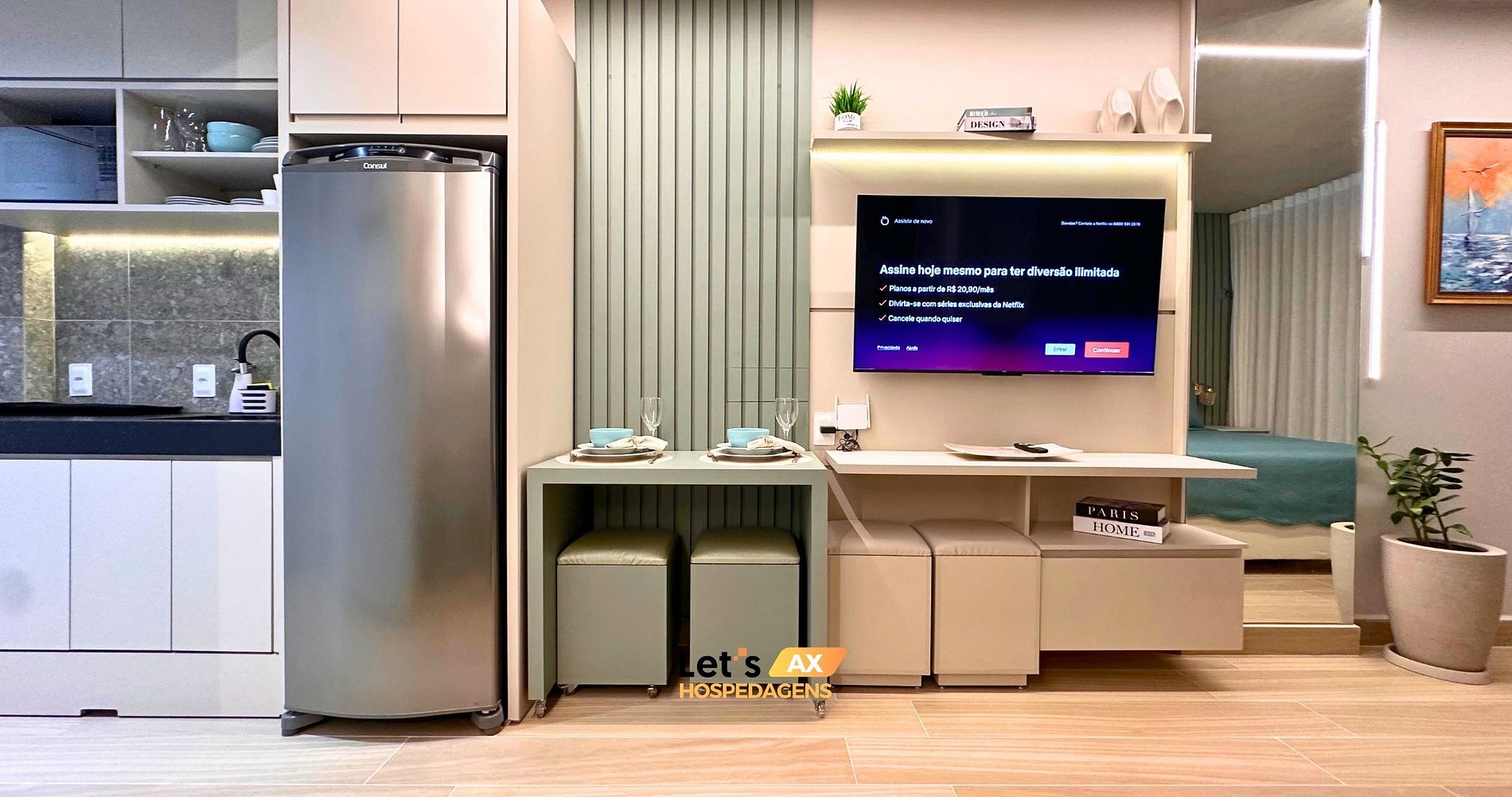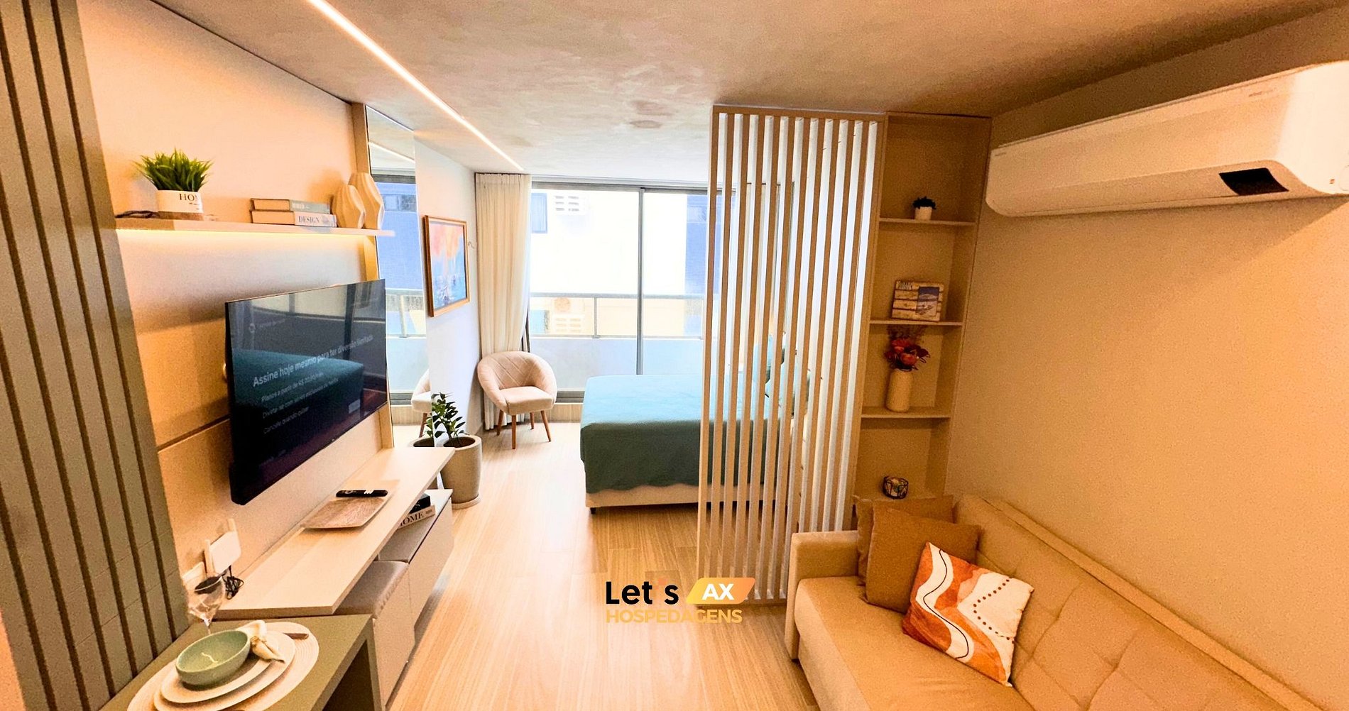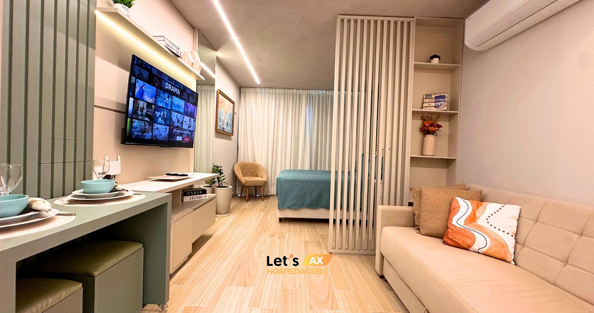 - Este Studio oferece: 01 Cama Queen, 01 Sofa cama e decoração sofisticada.