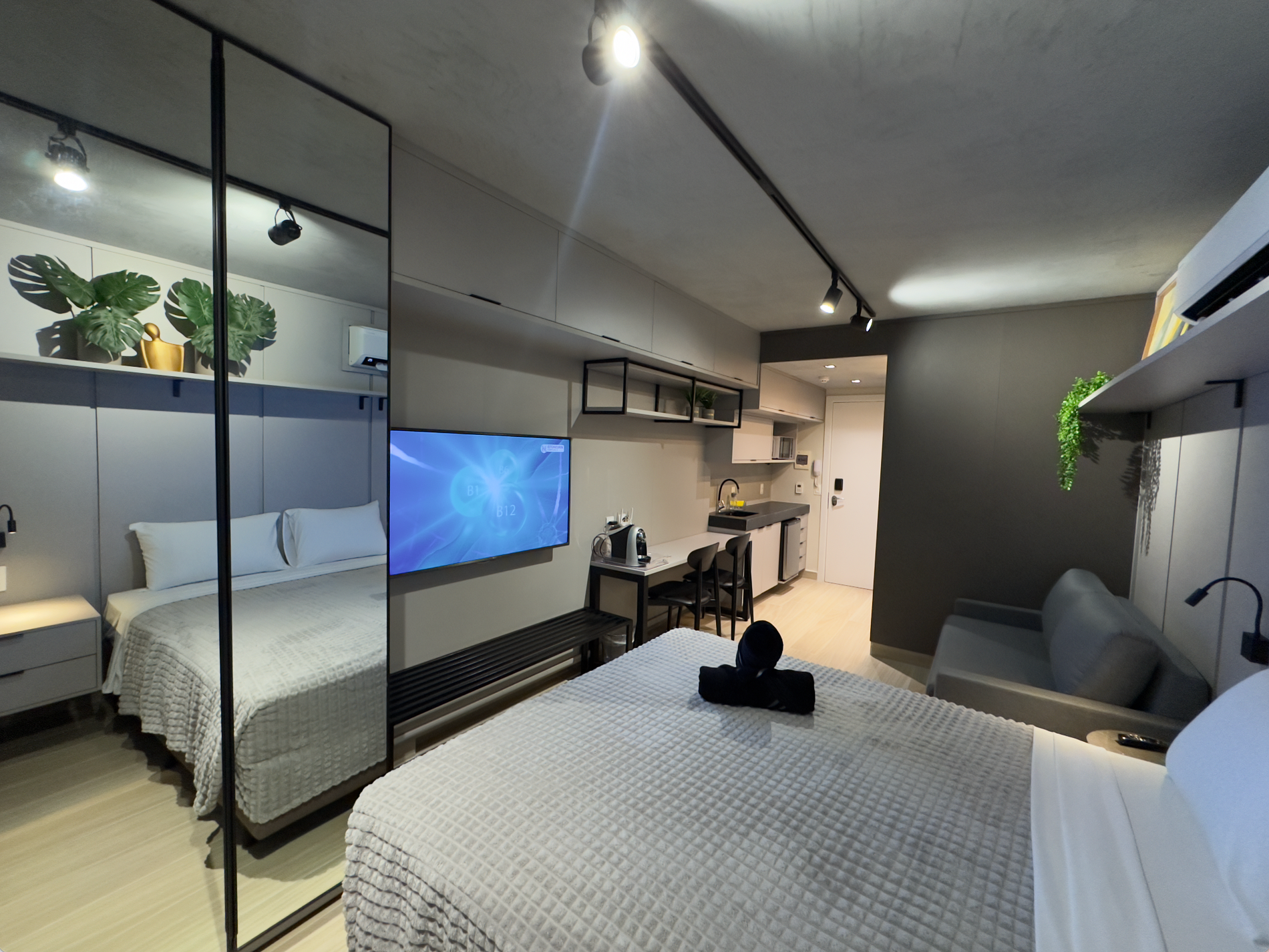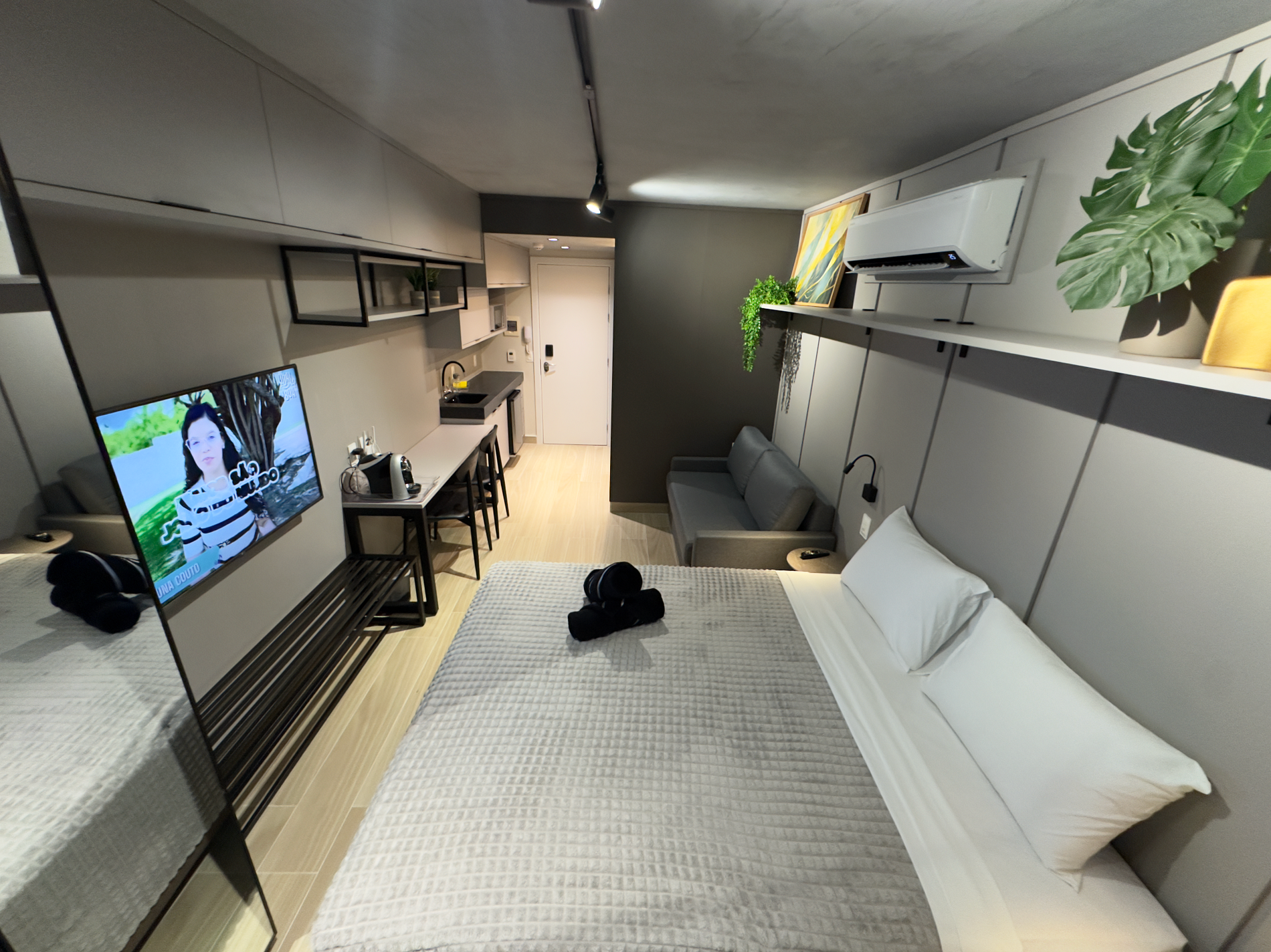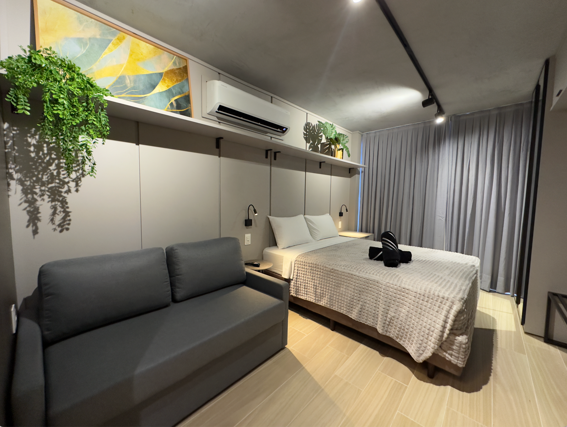 - Este Studio oferece: 01 Cama Queen, 01 Sofa cama e decoração sofisticada, lençóis premium, coberta, toalhas e travesseiros.