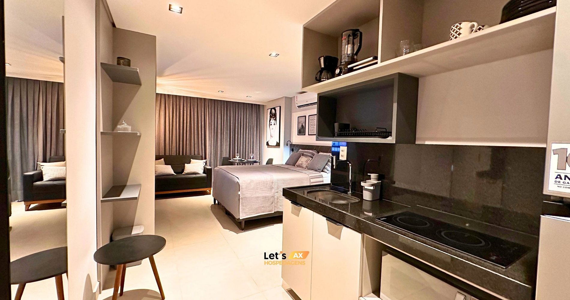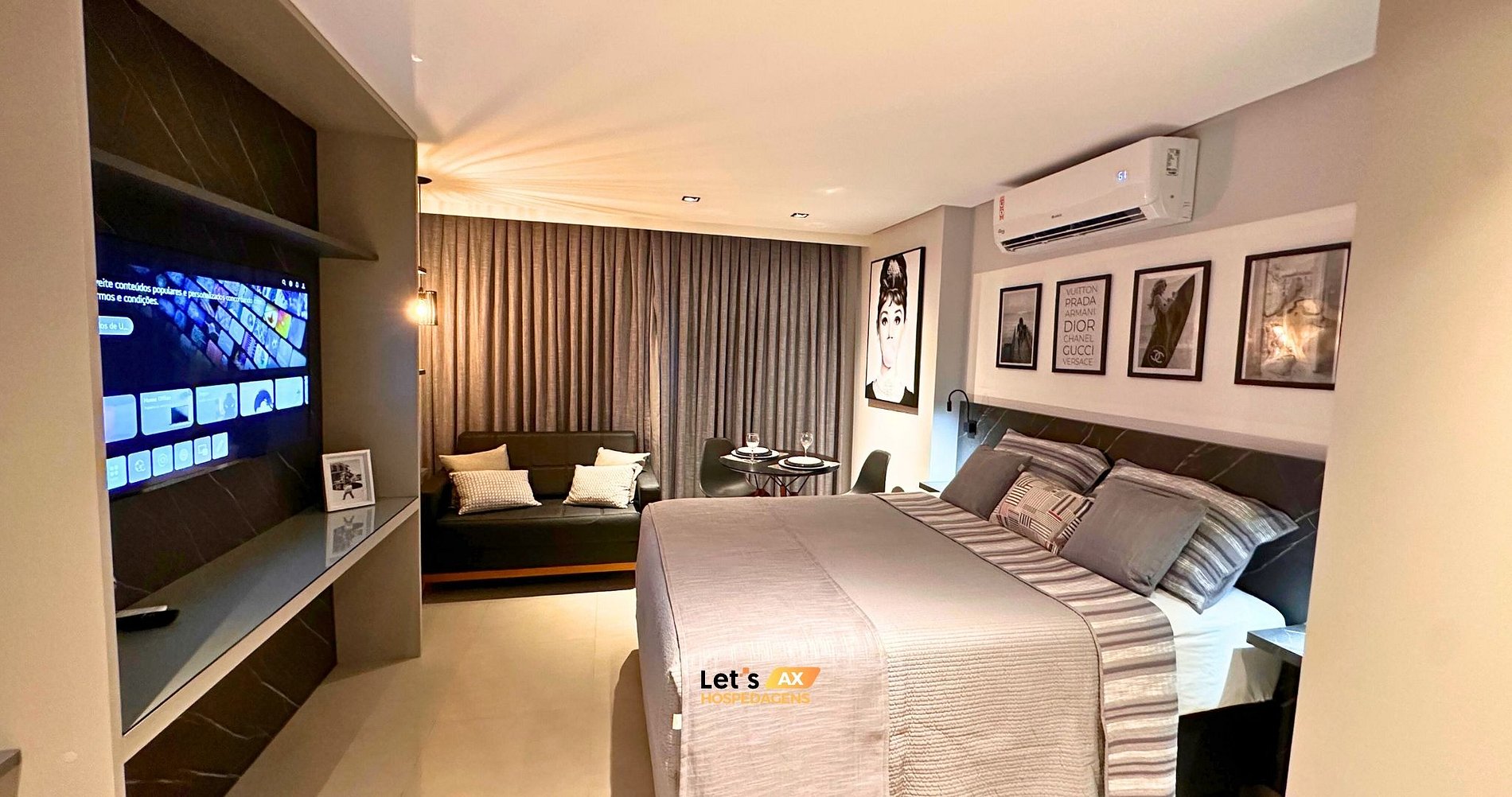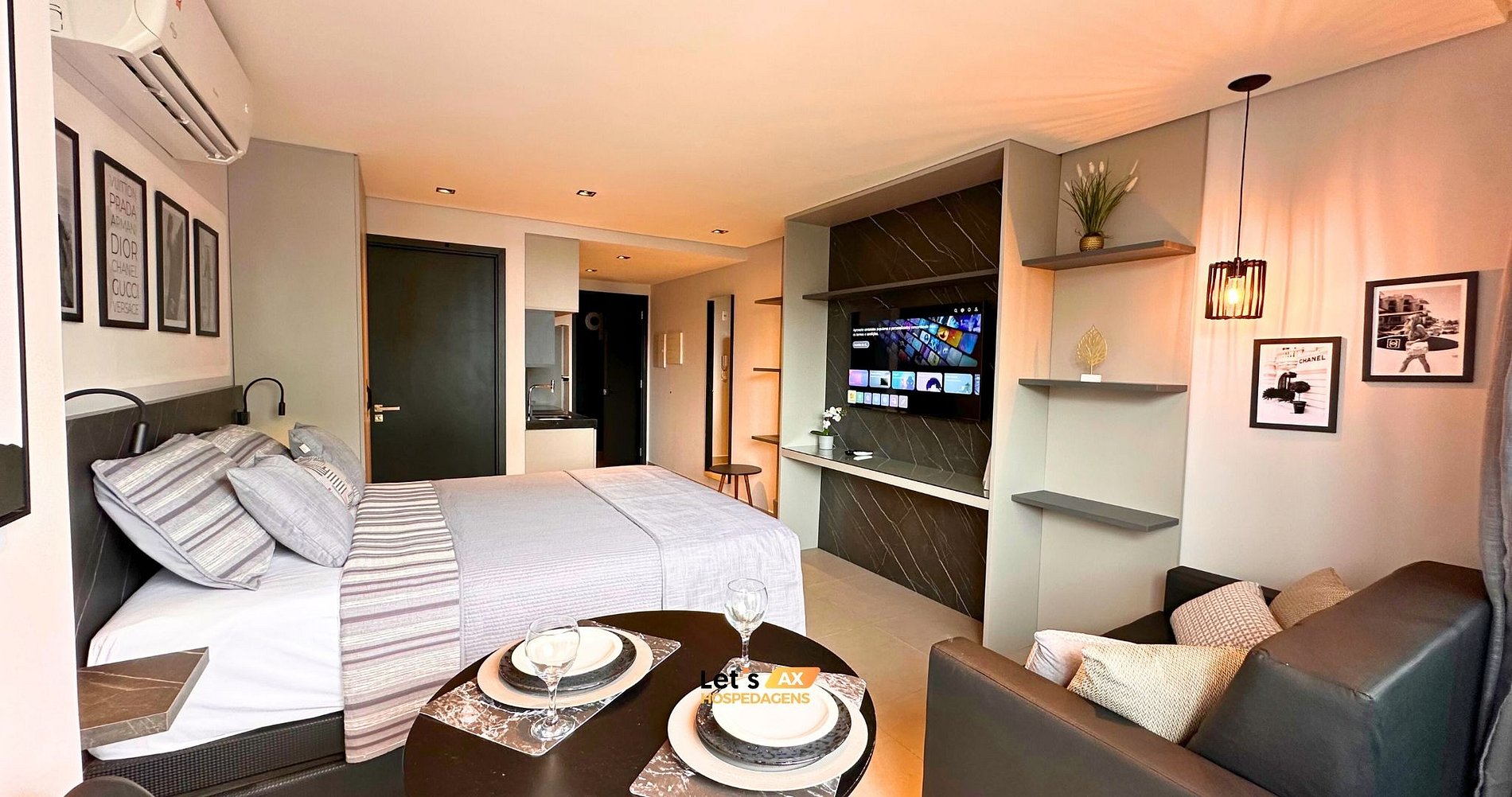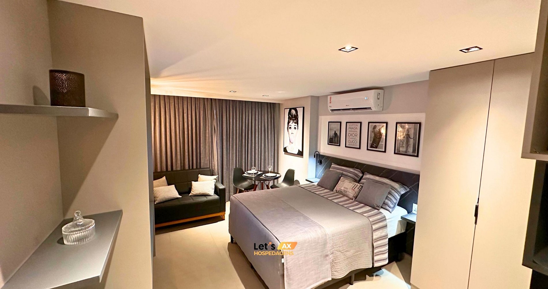 - Studio disponibilizando: Uma cama de casal e duas camas auxiliar solteiro, lençóis premium, coberta, toalhas e travesseiros.
