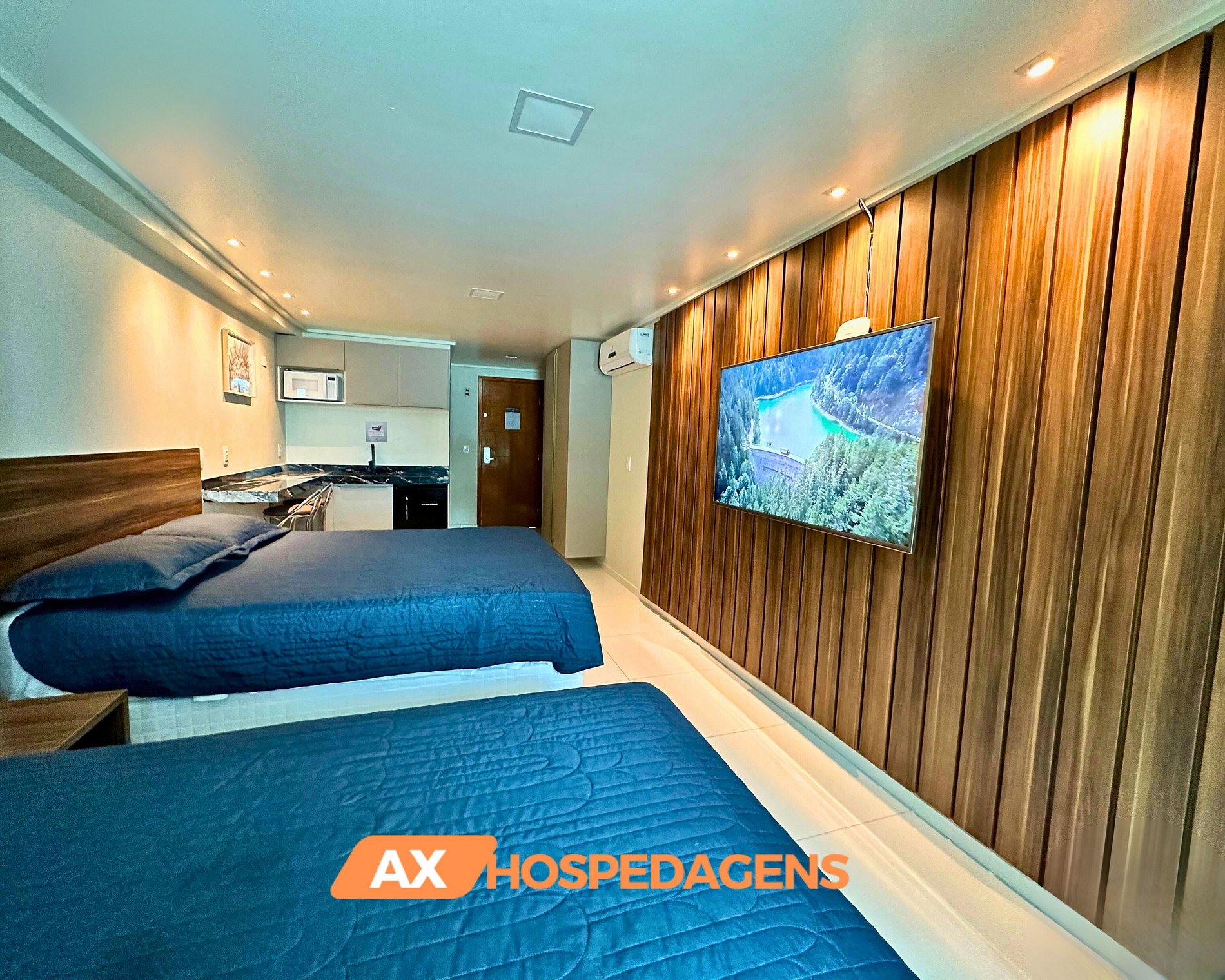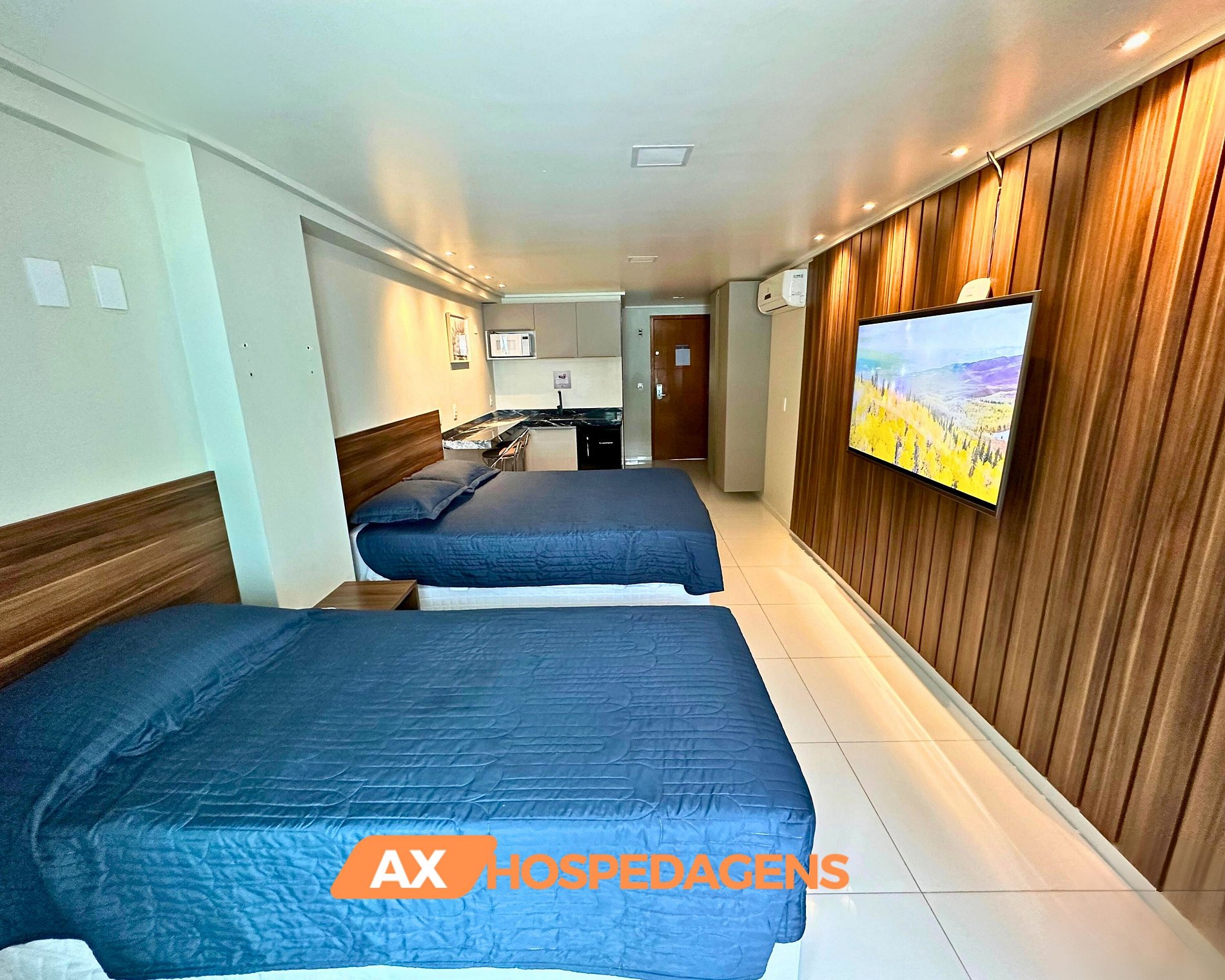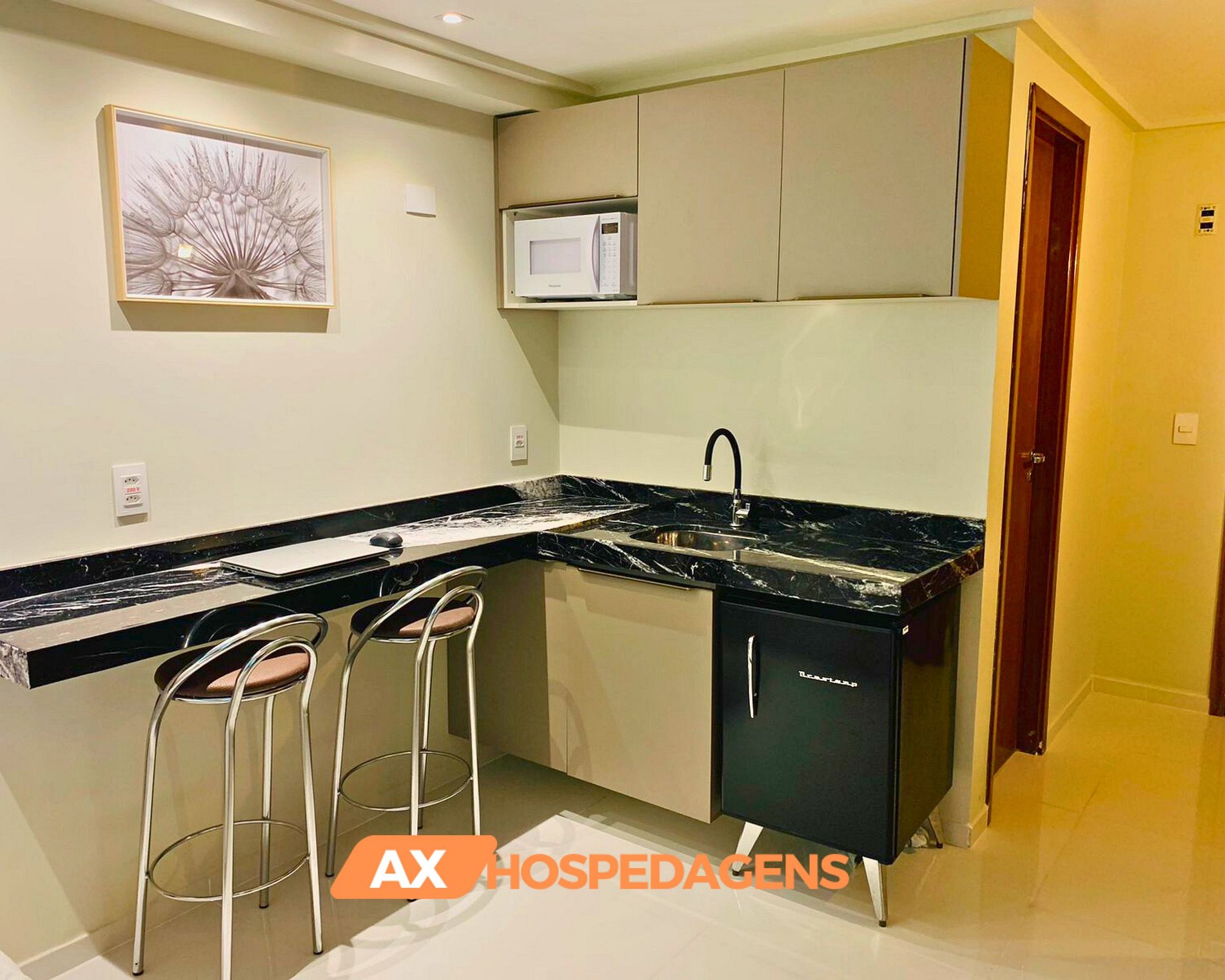 No studio disponibilizamos Ar Condicionado, tv 60 polegadas, toalhas, roupa de cama, frigobar, micro-ondas, sanduicheira, cafeteira, talheres, pratos, copos, xícaras.