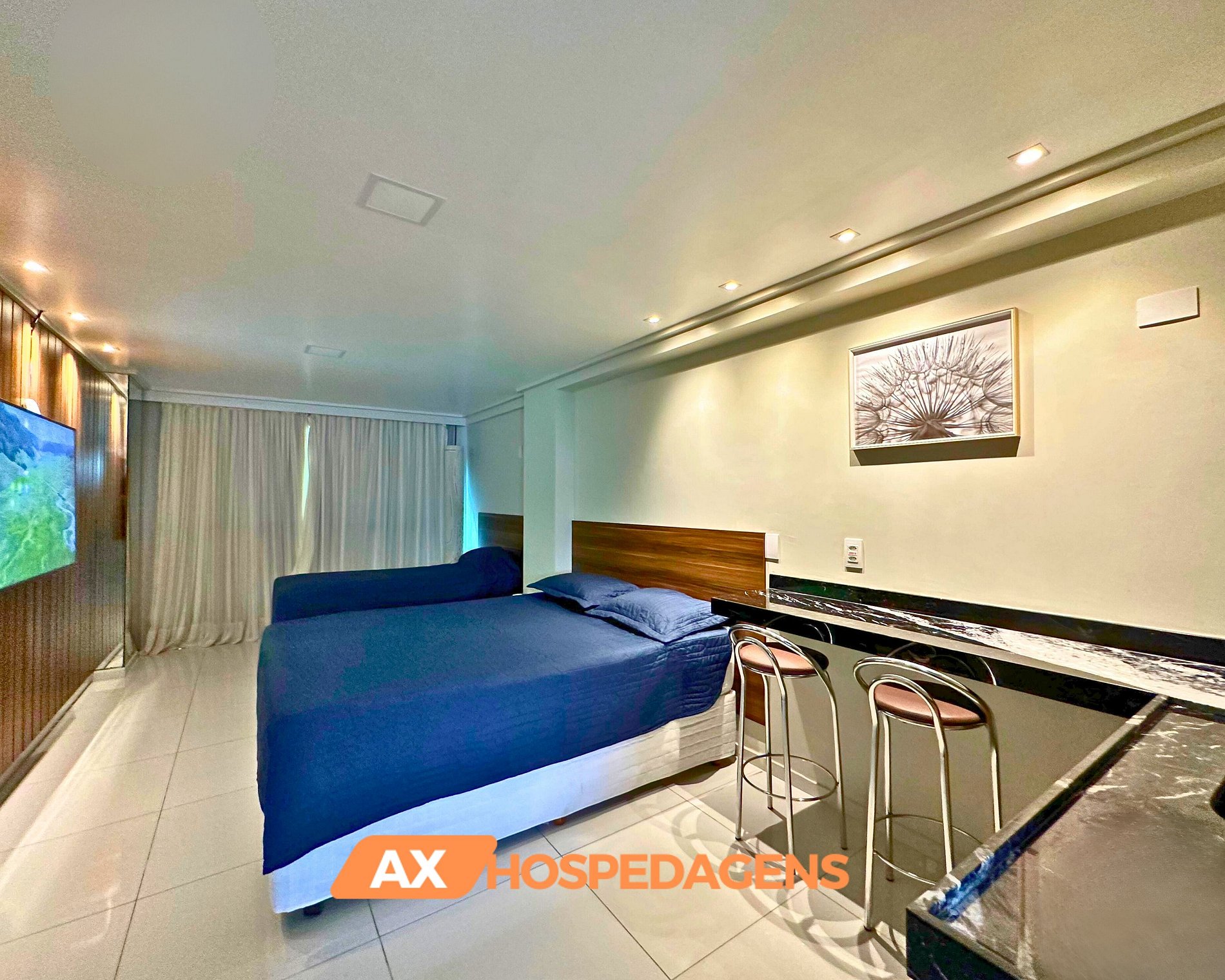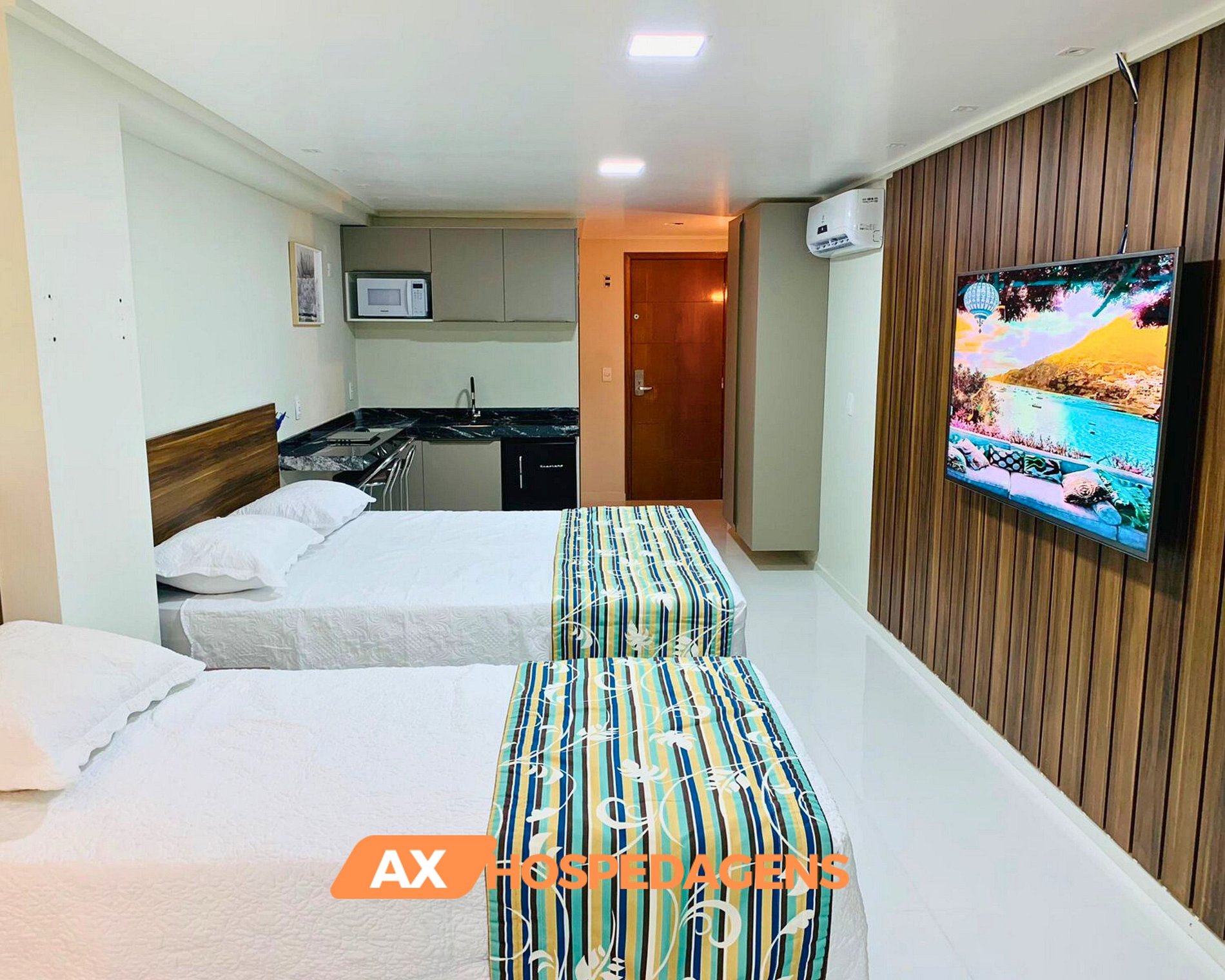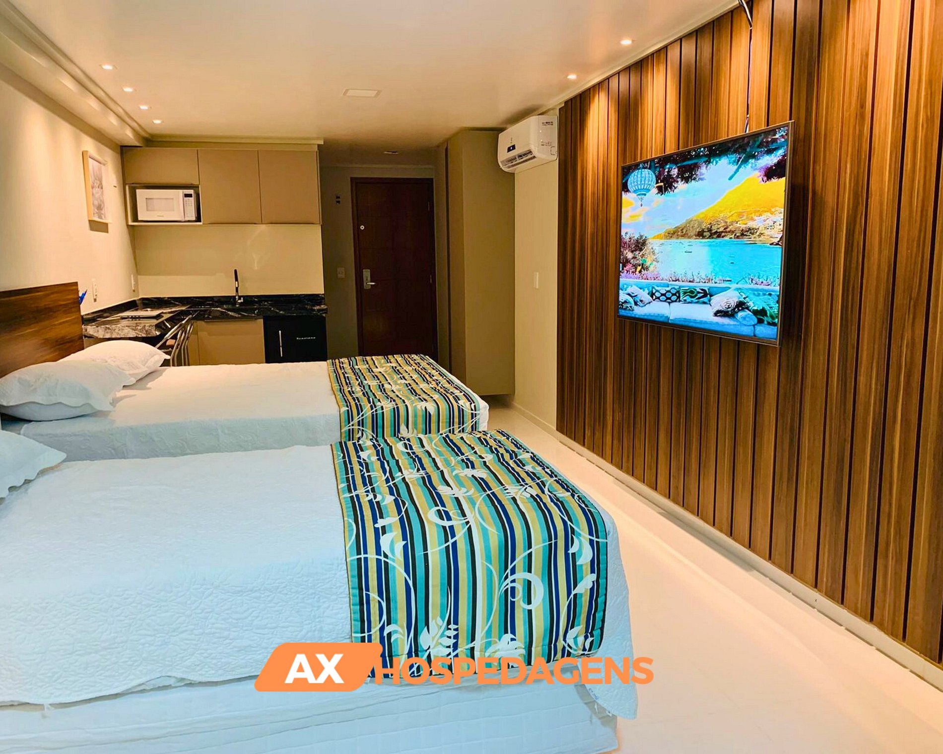 Studio luxo com varanda e vista parcial do mar, confortável e aconchegante , excelente para quem aprecia a natureza. O empreendimento fica beira mar na orla de Cabo Branco, entre a praia e uma área de preservação com uma mata cheia pássaros. Possui Ar Condicionado, tv 60 polegadas, toalhas, roupa de cama, frigobar, micro-ondas, sanduicheira, cafeteira, talheres, pratos, copos, xícaras.