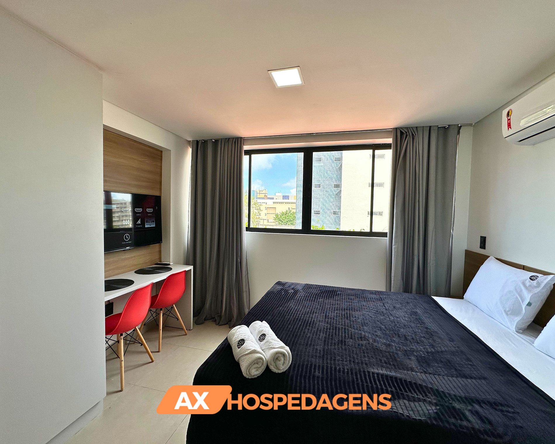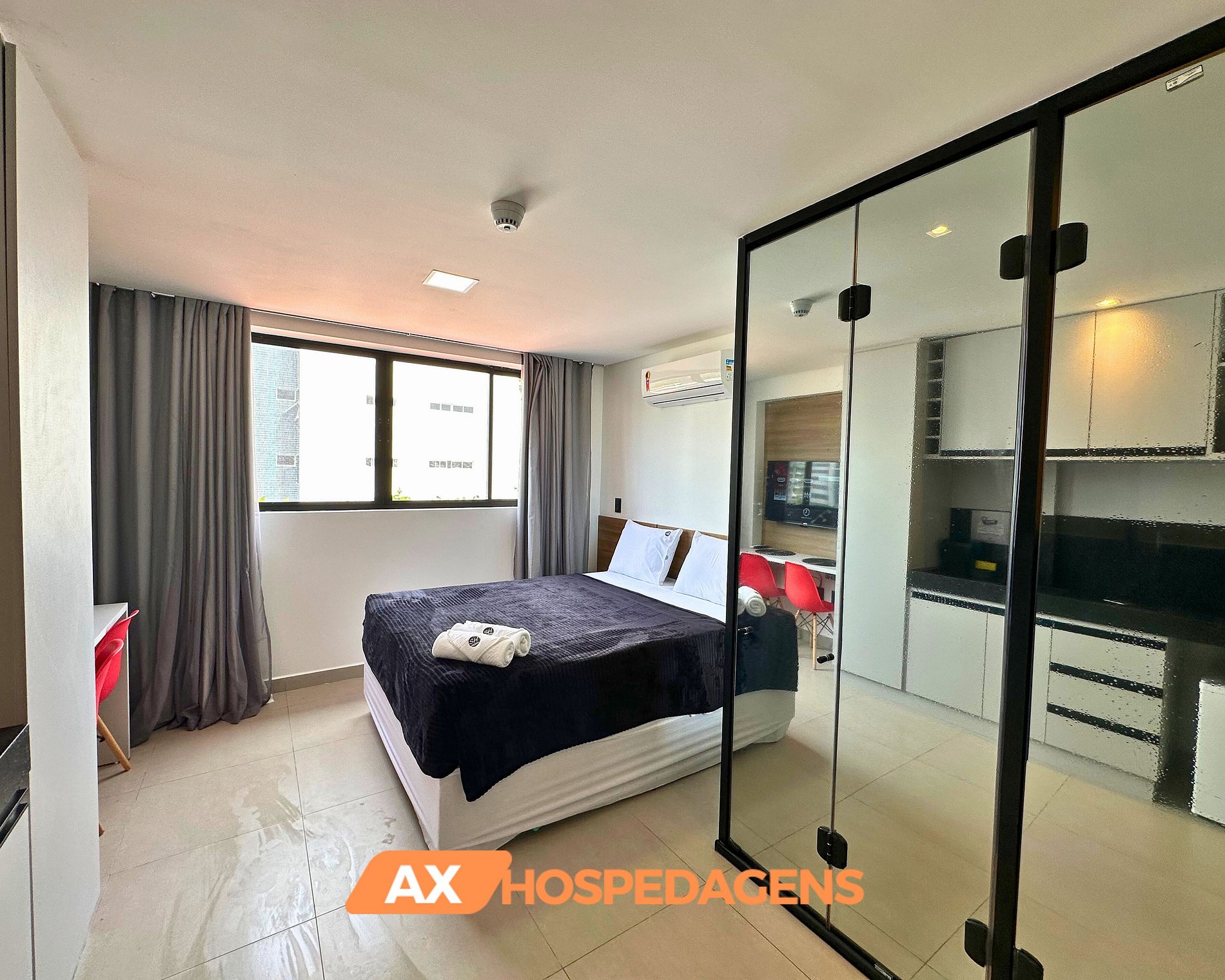 Relaxe neste espaço calmo e cheio de estilo, um apto Studio de 25m equipado e todo decorado. Fica super bem localizado na praia do Bessa e a 2 min a pé da areia da praia. Está equipado com tv smart, wi-fi gratuito, ar condicionado, frigobar, cafeteira, sanduicheira e alguns utensílios de cozinha.