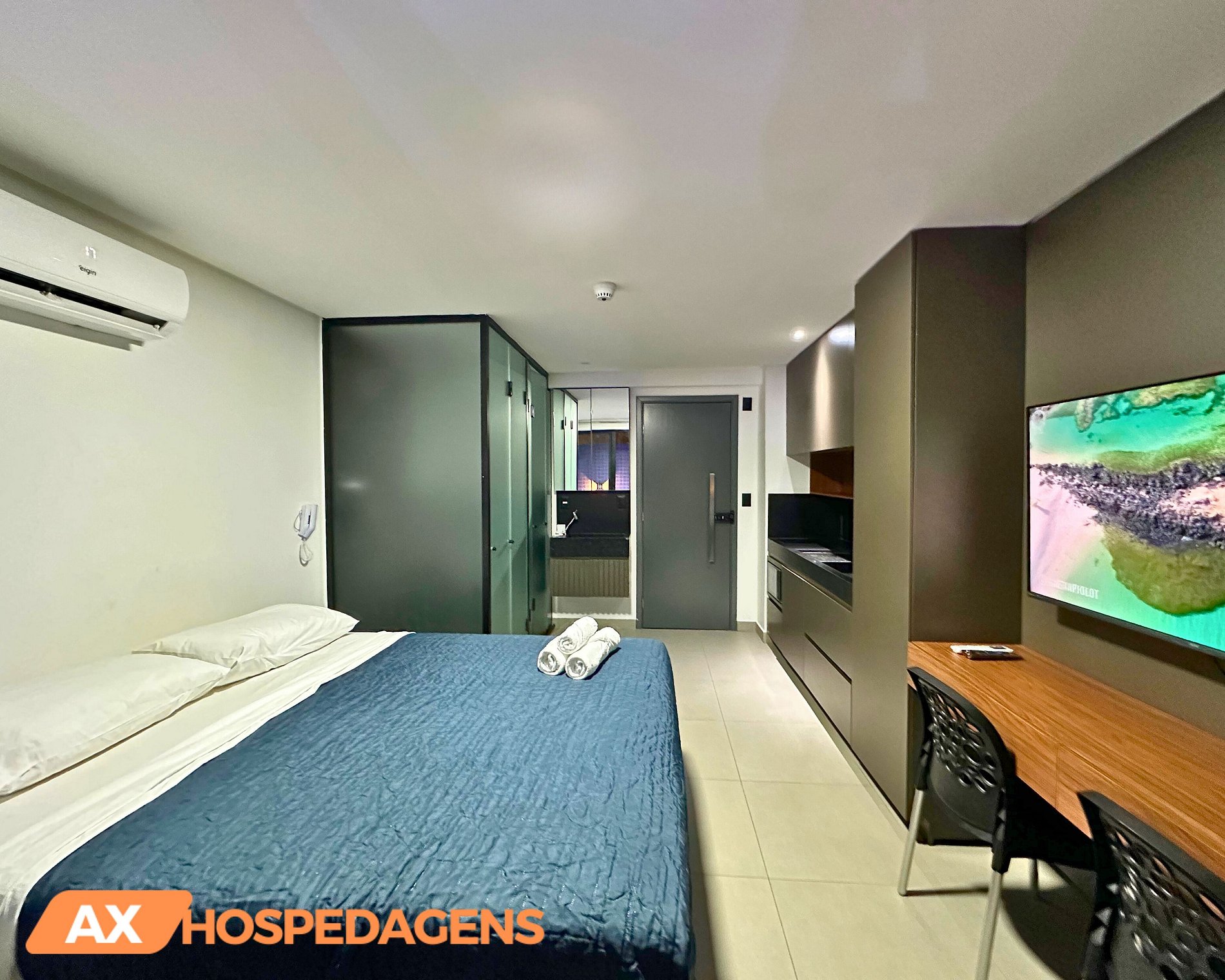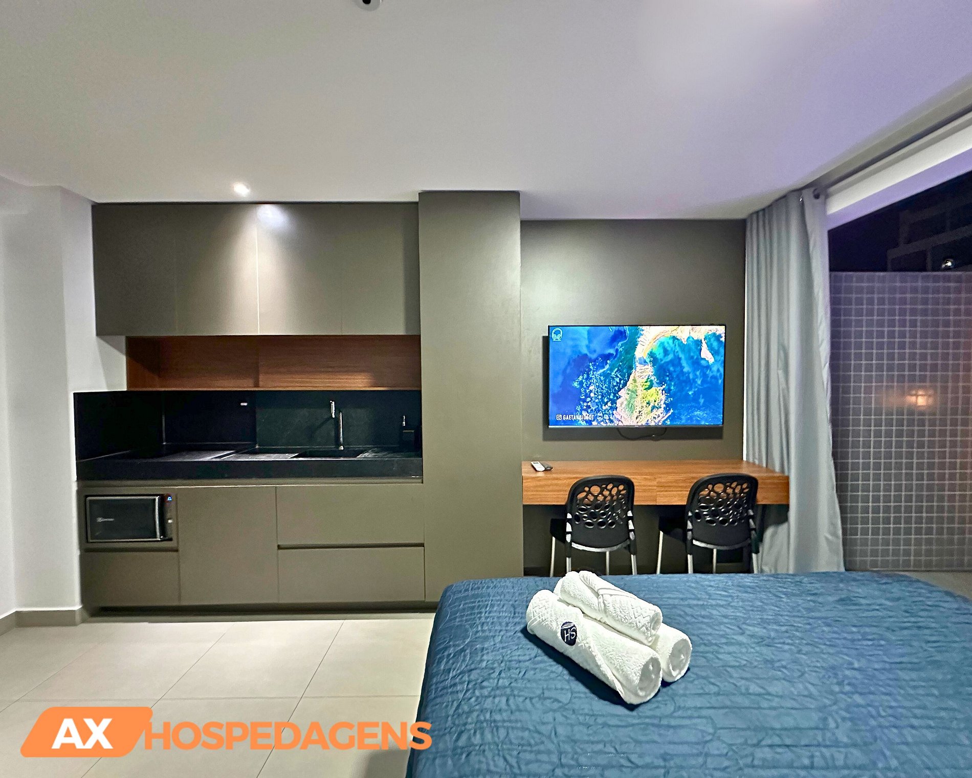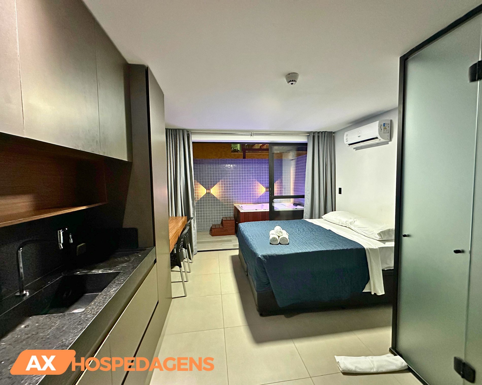 Relaxe neste espaço calmo e cheio de estilo, um apto Studio de 25m equipado e todo decorado. Fica super bem localizado na praia do Bessa e a 2 min a pé da areia da praia. Está equipado com tv smart, wi-fi gratuito, ar condicionado, frigobar, cafeteira, sanduicheira e alguns utensílios de cozinha.
